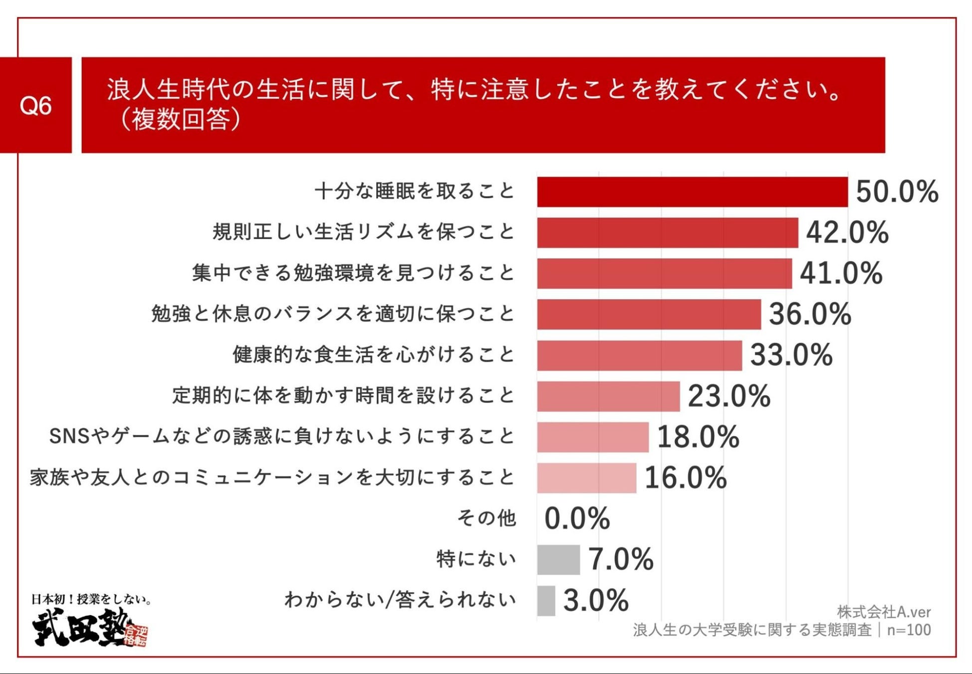 「Q6.浪人生時代の生活に関して、特に注意したことを教えてください。(複数回答)」(n=100)と質問したところ、「十分な睡眠を取ること」が50.0%、「規則正しい生活リズムを保つこと」が42.0%、「集中できる勉強環境を見つけること」が41.0%という回答となりました。