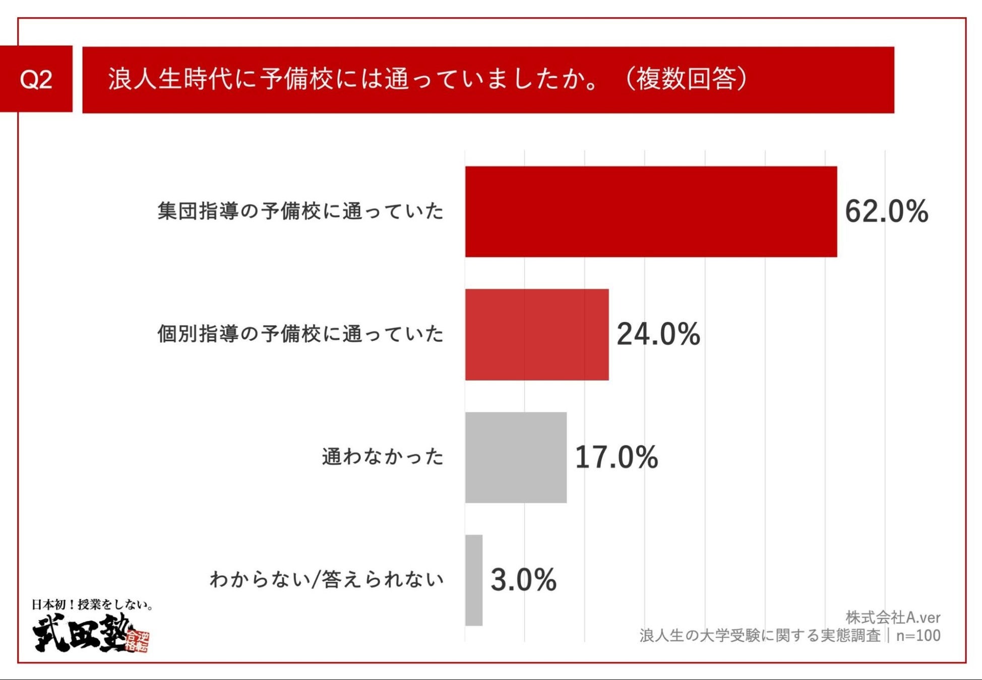 学習塾「武田塾」を全国に展開している株式会社A.ver(本社:東京都文京区 以下「武田塾」)は、大学受験時に浪人を経験後、第一志望に合格した学生100名を対象に、浪人生の大学受験に関する実態調査を実施しましたので、お知らせいたします。