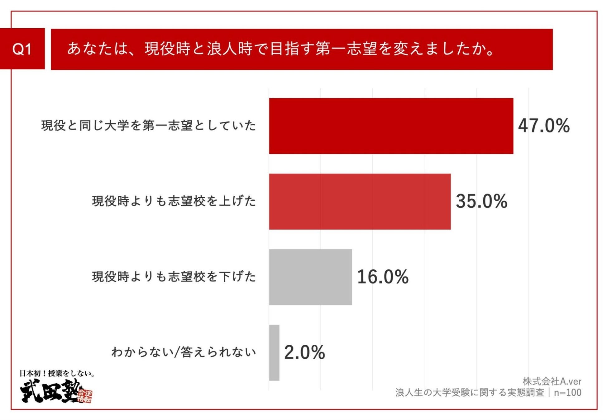 「Q1.あなたは、現役時と浪人時で目指す第一志望を変えましたか。」(n=100)と質問したところ、「現役と同じ大学を第一志望としていた」が47.0%、「現役時よりも志望校を上げた」が35.0%、「現役時よりも志望校を下げた」が16.0%という回答となりました。