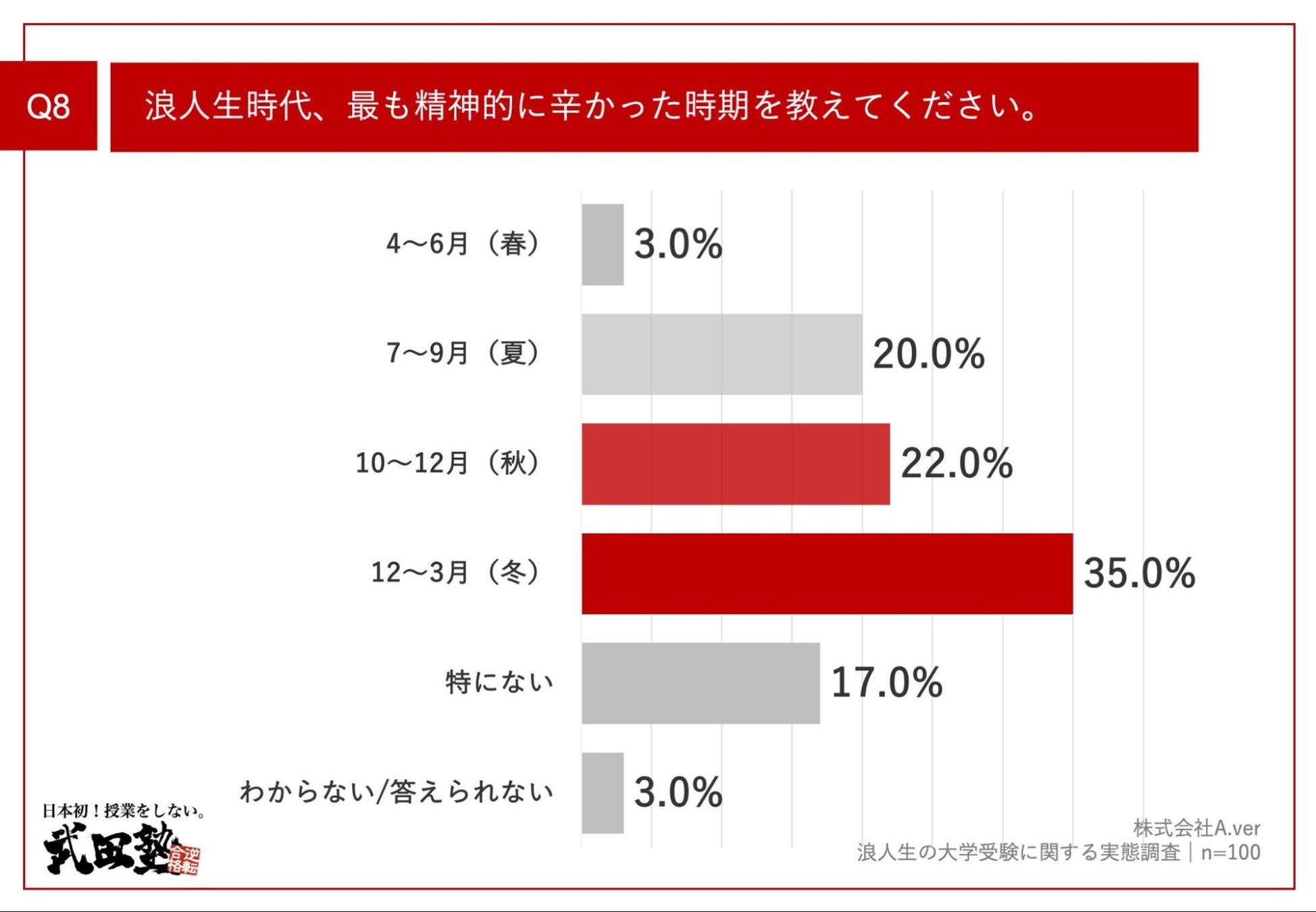 「Q8.浪人生時代、最も精神的に辛かった時期を教えてください。」(n=100)と質問したところ、「12~3月(冬)」が35.0%、「10~12月(秋)」が22.0%という回答となりました。