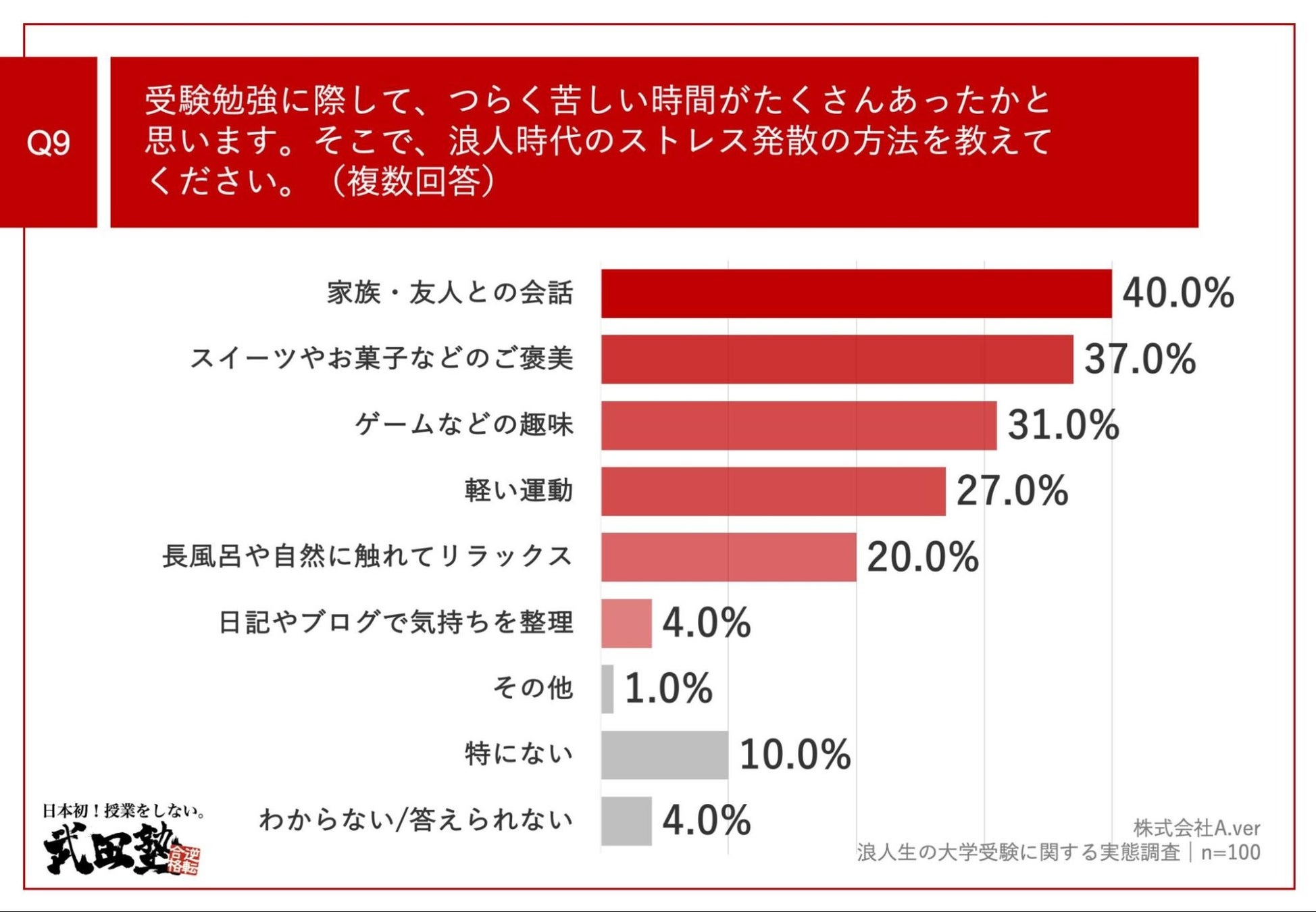 「Q9.受験勉強に際して、つらく苦しい時間がたくさんあったかと思います。そこで、浪人時代のストレス発散の方法を教えてください。(複数回答)」(n=100)と質問したところ、「家族・友人との会話」が40.0%、「スイーツやお菓子などのご褒美」が37.0%、「ゲームなどの趣味」が31.0%という回答となりました。