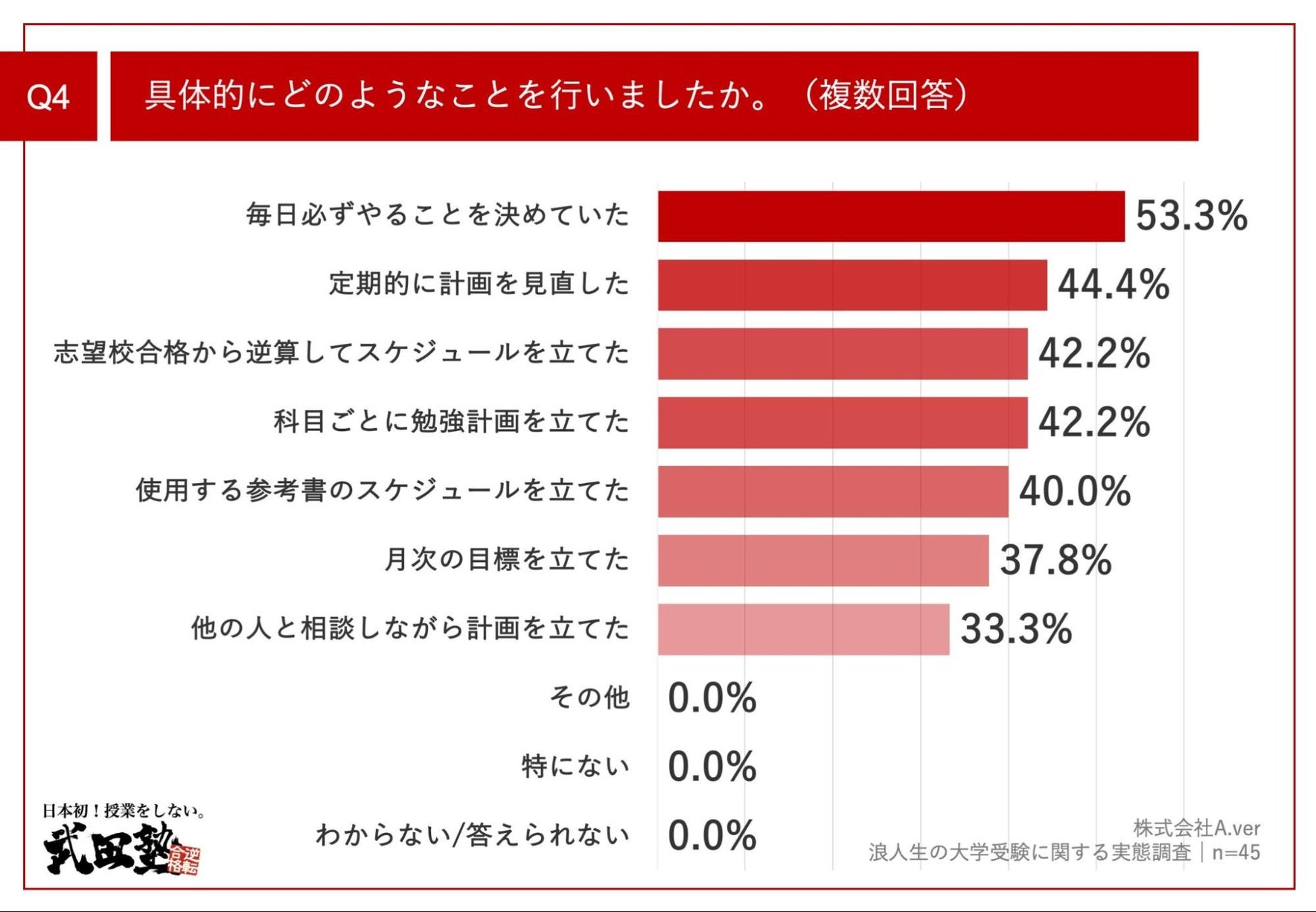 Q4で「勉強計画をしっかりと立てること」と回答した方に、「Q4.具体的にどのようなことを行いましたか。(複数回答)」(n=45)と質問したところ、「毎日必ずやることを決めていた」が53.3%、「定期的に計画を見直した」が44.4%、「志望校合格から逆算してスケジュールを立てた」が42.2%という回答となりました。