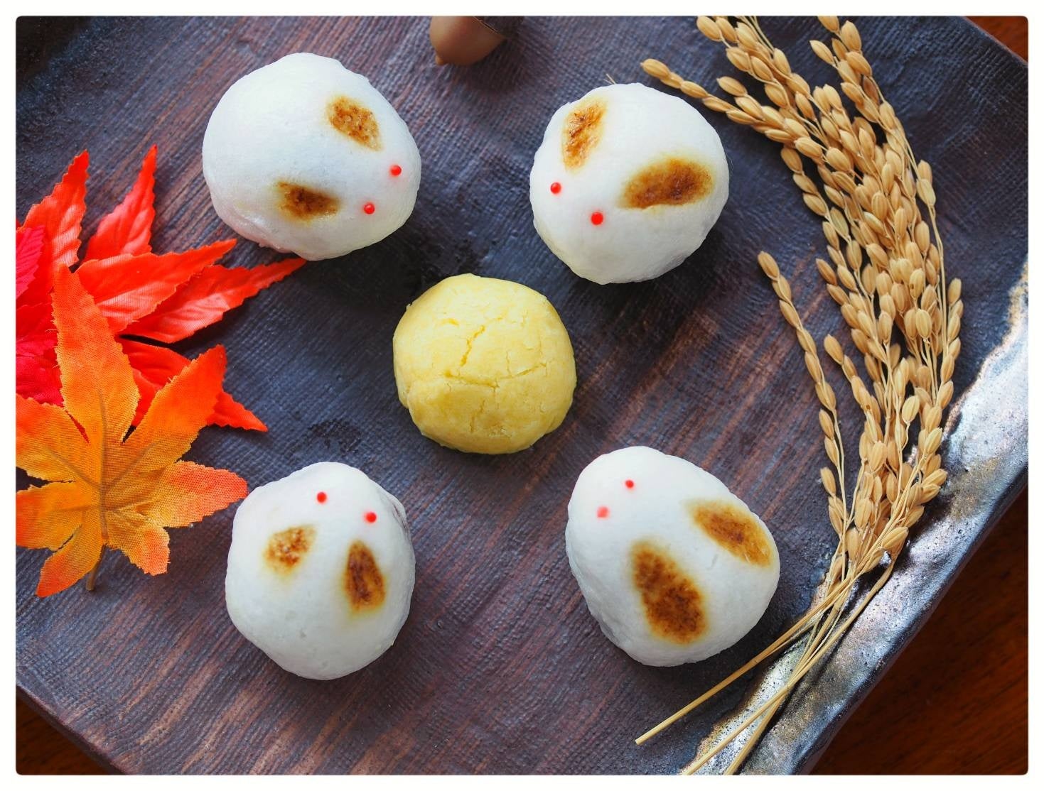 饅頭をコロンと丸い卵型に成型し蒸し上げた後、焼きごてで耳をつけ、可愛らしいうさぎを表現しました。目は羊羹で1つ1つ絞り袋(羊かんグラス)で絞り、つぶらで可愛い目に仕上げました。