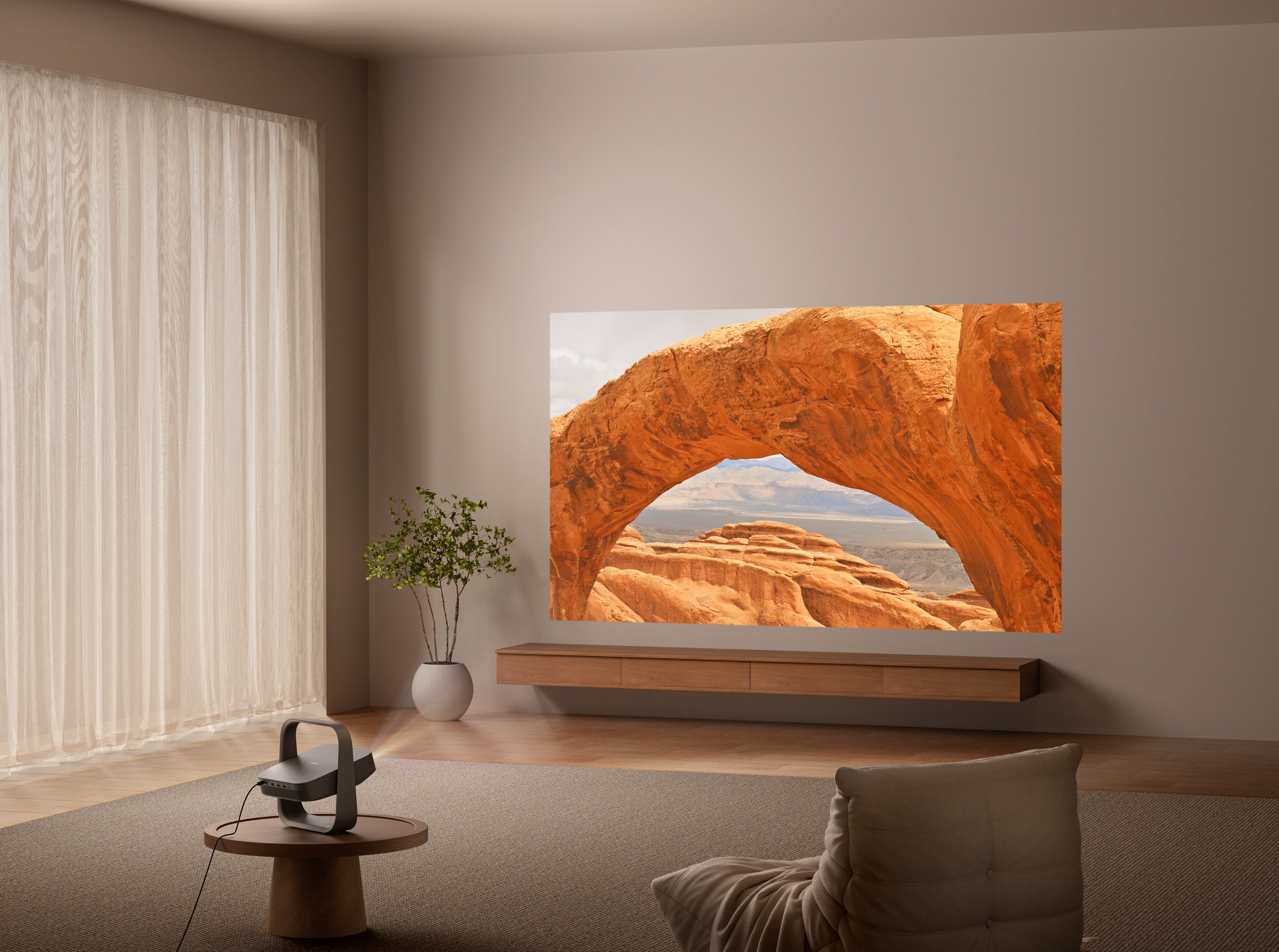 150°回転可能なジンバル一体型の薄型設計により、壁や天井への投影など自由な設置を実現。本棚などの限られたスペースにもすっきり収まり、日常空間に自然に溶け込みます。日亜化学工業製の最新世代NUMB42 3色レーザー(QuaLas® RGBシリーズ)を採用し、1600 ISOルーメンの高輝度と豊かな色再現性を実現。フルHD解像度ながら、レーザー光源ならではの鮮やかな映像体験を楽しめます。OSはGoogle TVを搭載しています。