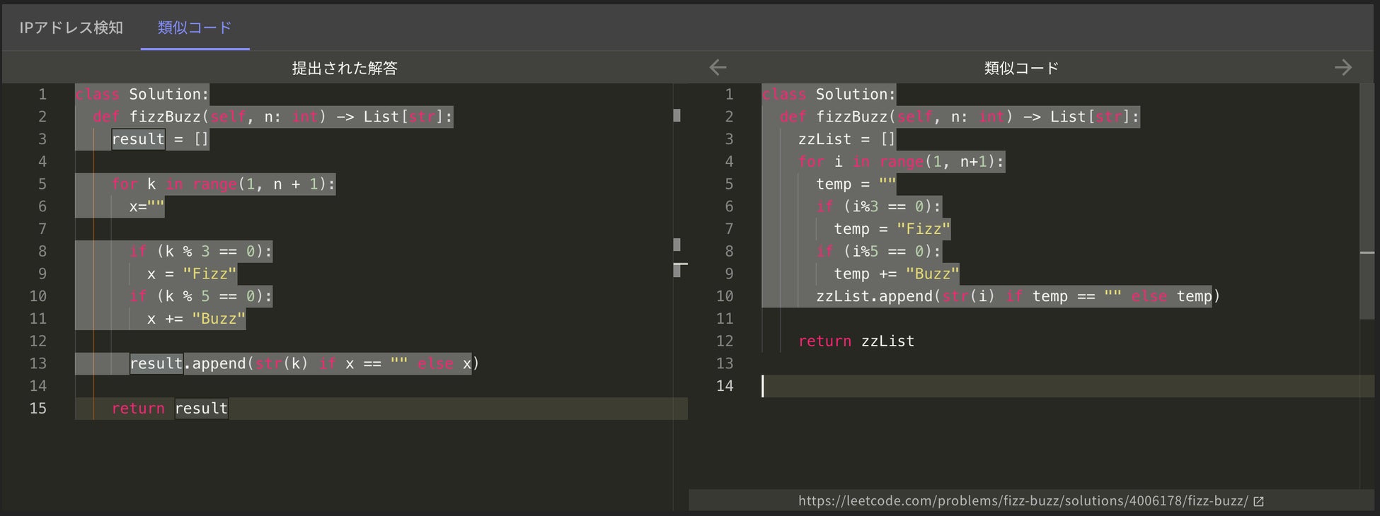 候補者に提出された解答(左)とWeb上のコード(右)を比較し、類似している部分を白くハイライトします。
