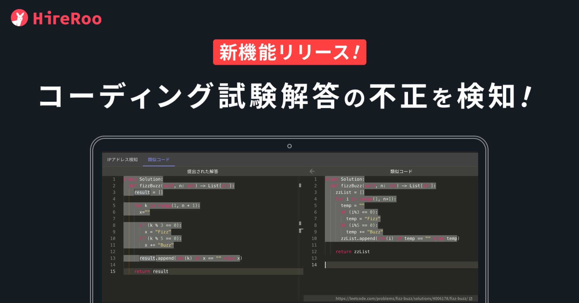 コーディング試験サービス『HireRoo(ハイヤールー)』( https://hireroo.io )を提供する株式会社ハイヤールー(本社:東京都渋谷区、代表取締役:葛岡宏祐)は、Web上のコードを利用した不正な解答を検知する機能をリリースいたしました。