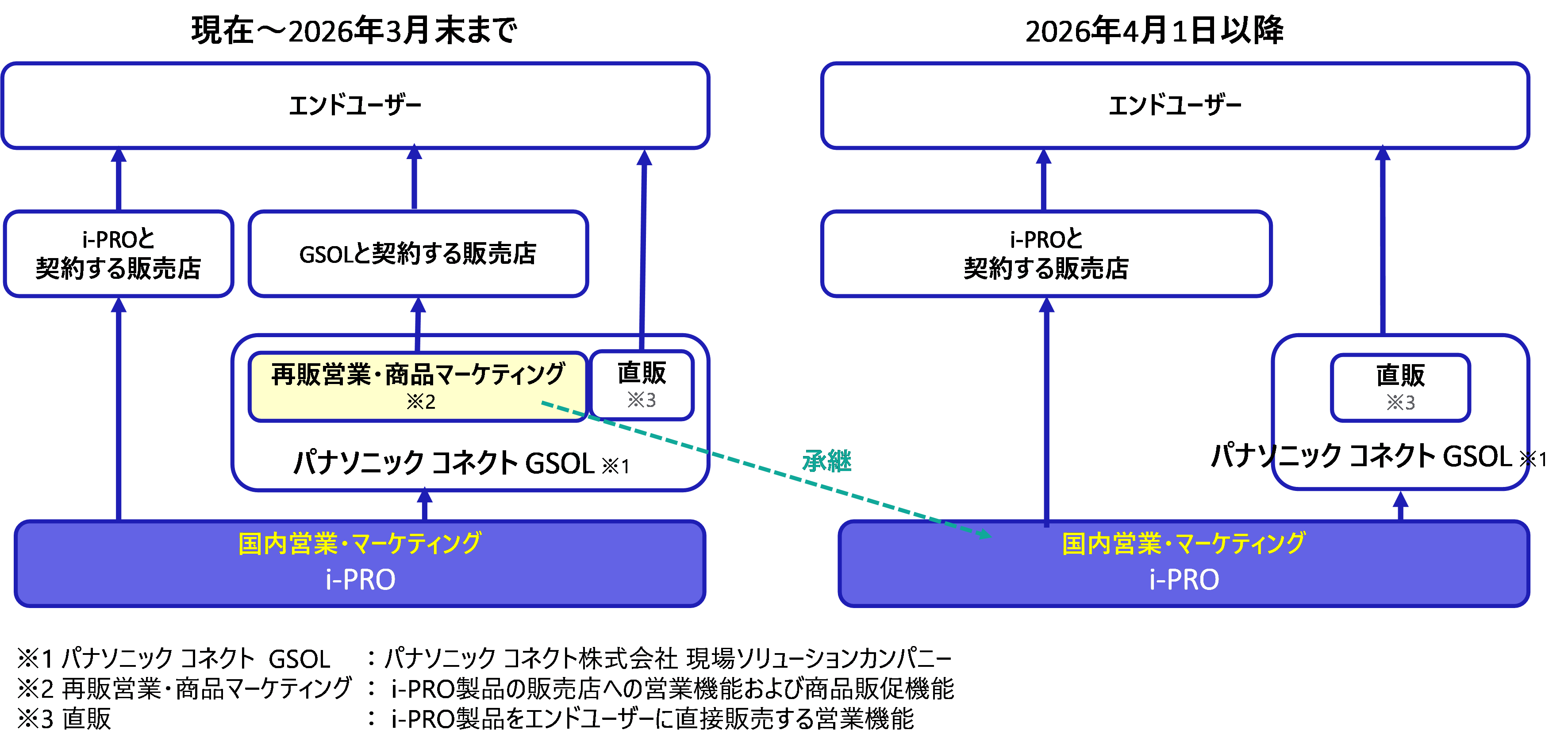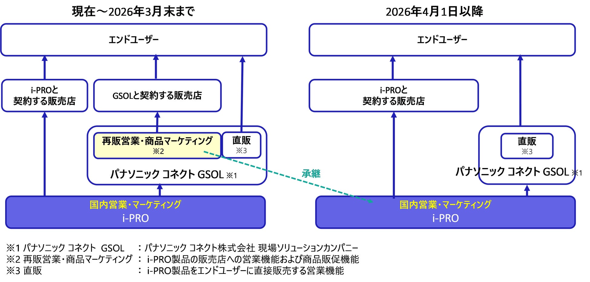 2026年4月1日以降は、i-PRO製品を扱うGSOLの販売店約500社は、当社と直接取引いただくことになります。なお、当社製品をGSOLよりご購入いただいているエンドユーザー様およびパナソニック株式会社 エレクトリックワークス社よりご購入いただいているお客様におかれましては、契約の変更はございません。