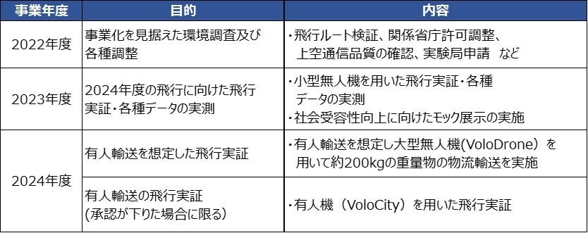 | Volocopter | ・機体飛行実証の実施 ・機体認証や許認可の取得など実装に向けた機体開発の推進 ・実証用簡易ポート設置 ・ルート検証 |