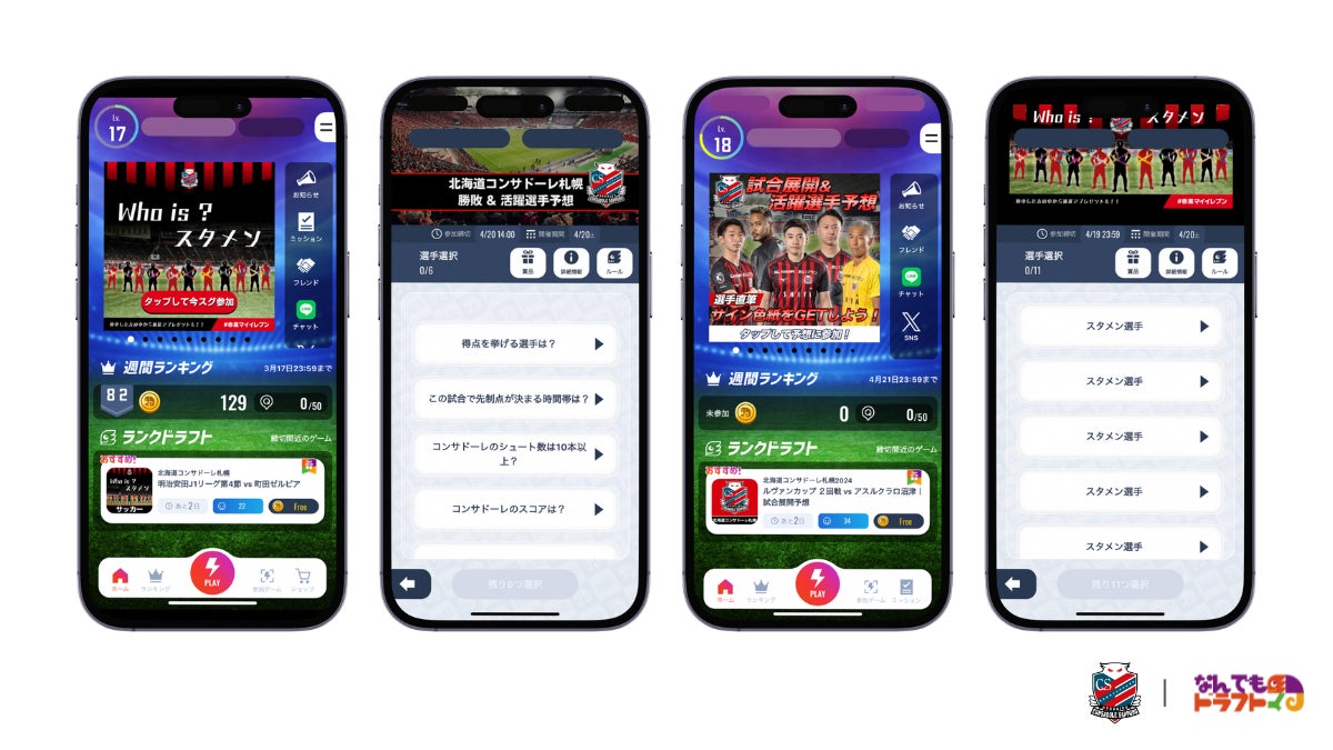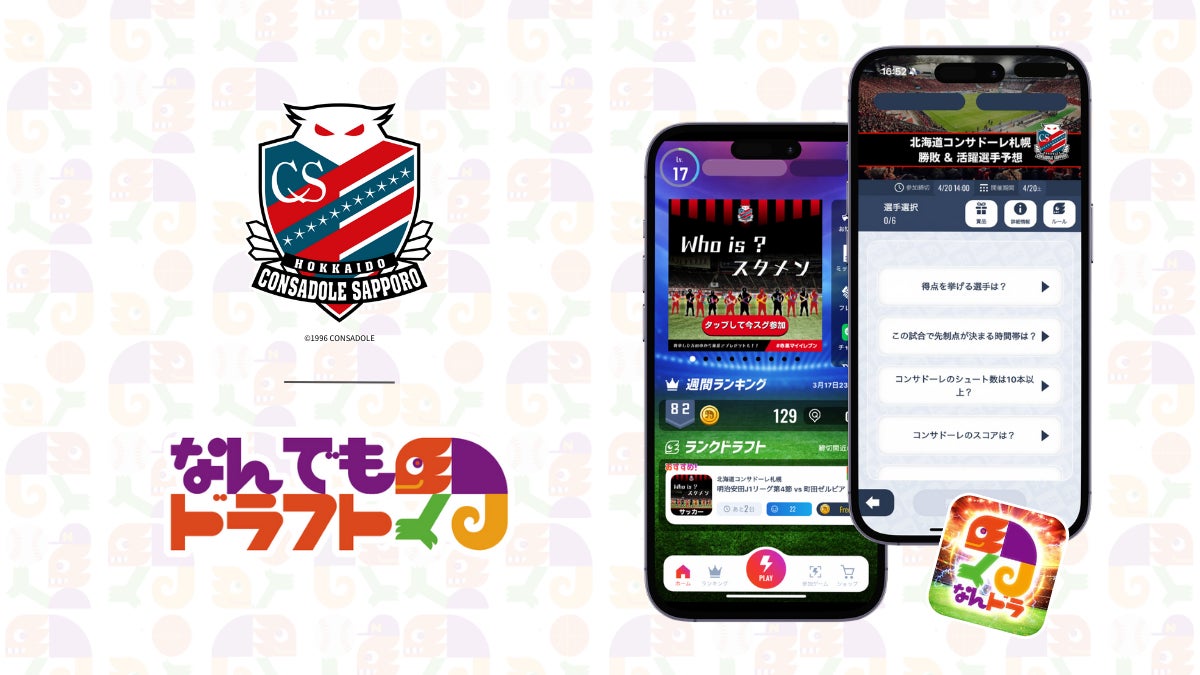 イノベーションの力で新たなスポーツ・エンターテインメントを創造し、まだ見ぬ感動と熱狂を届ける株式会社なんでもドラフト(本社:東京渋谷区、代表:森井啓允、以下「なんでもドラフト」)は、サッカー/J1 北海道コンサドーレ札幌を運営する株式会社コンサドーレ(本社:北海道札幌市、代表取締役GM:三上 大勝、以下「北海道コンサドーレ札幌」)と2024シーズンのパートナーシップを通じて、スポーツ予想アプリ「なんドラ」を活用したファンエンゲージメント&スポンサーアクティベーション施策に取り組みます。