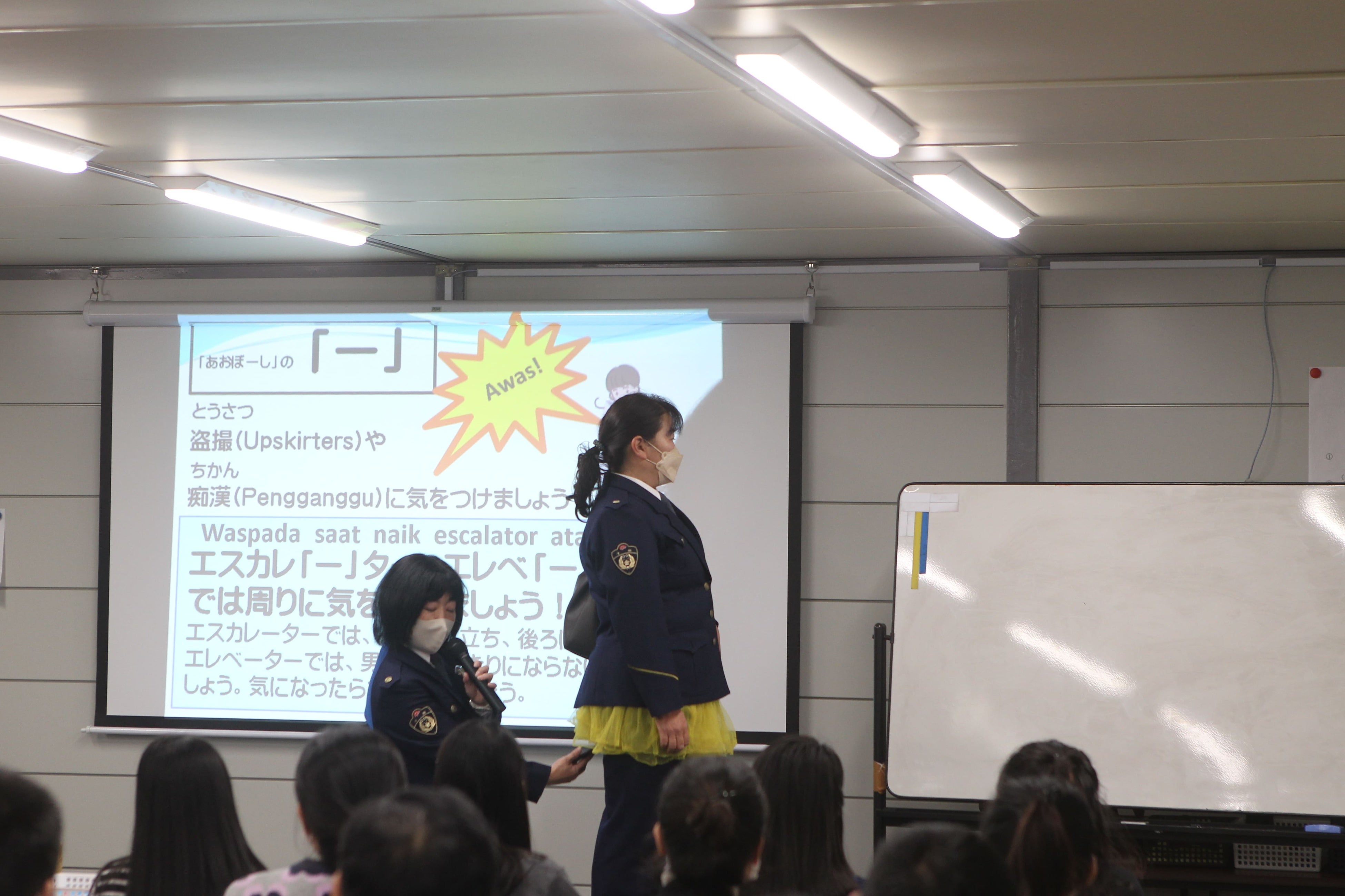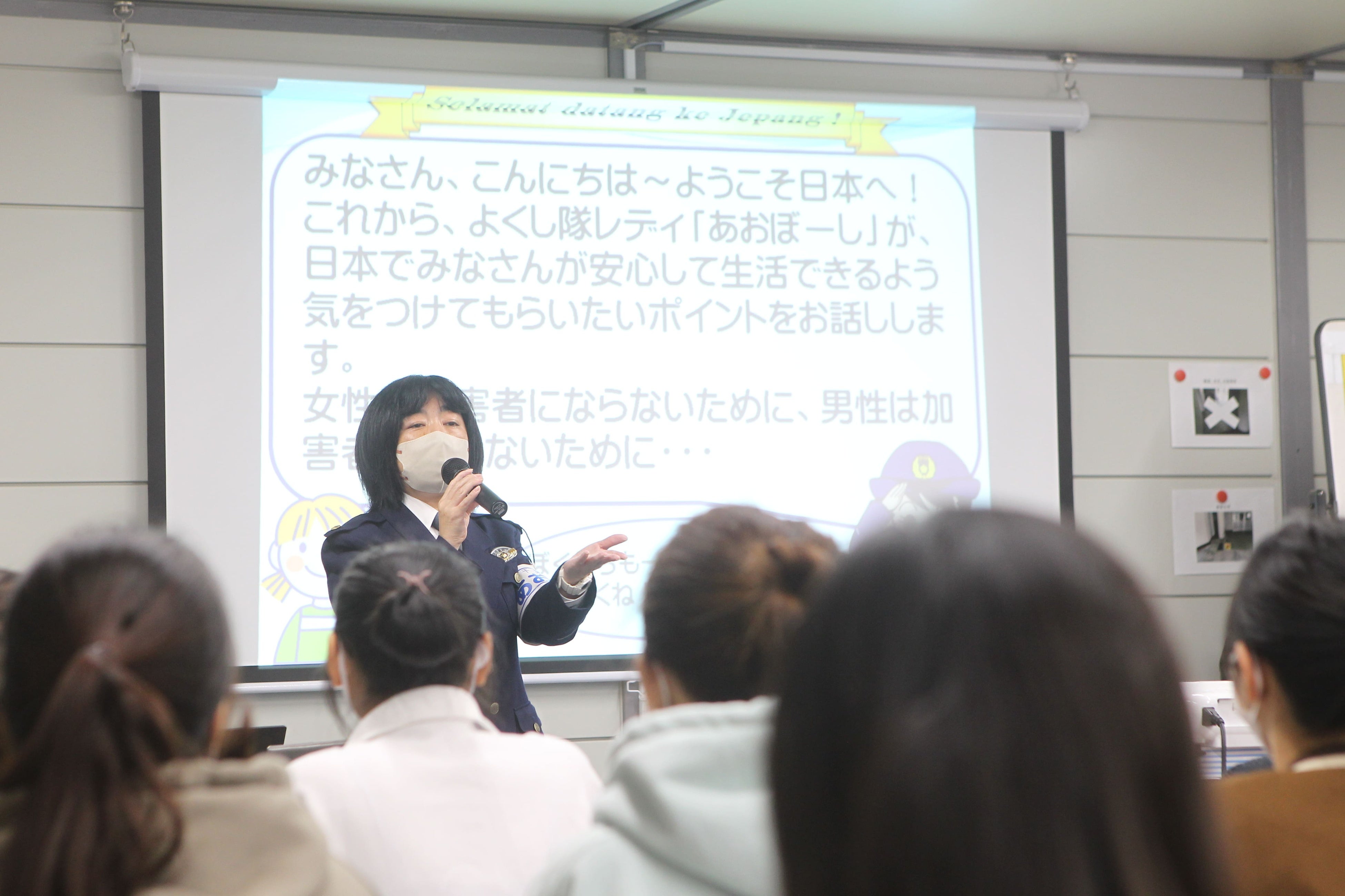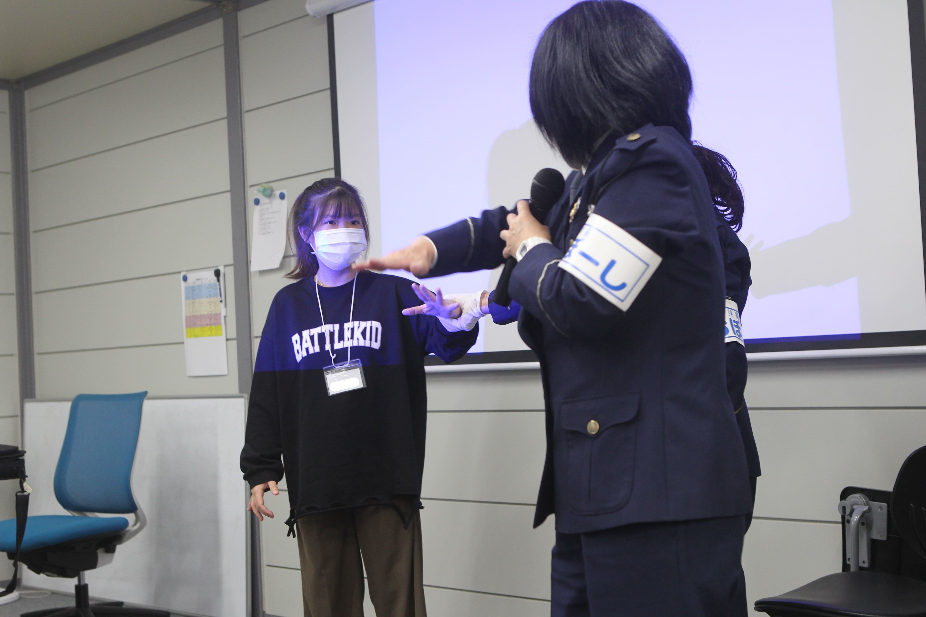 県警本部のよくし隊レディ「あおぼーし」が盗撮の手口や犯罪に巻き込まれないための対策、護身術を実演しました。賭博が犯罪であることや薬物の危険性についても伝えました。また、罪を犯したときの罰金や罰則等、日本の法律についても学びました。