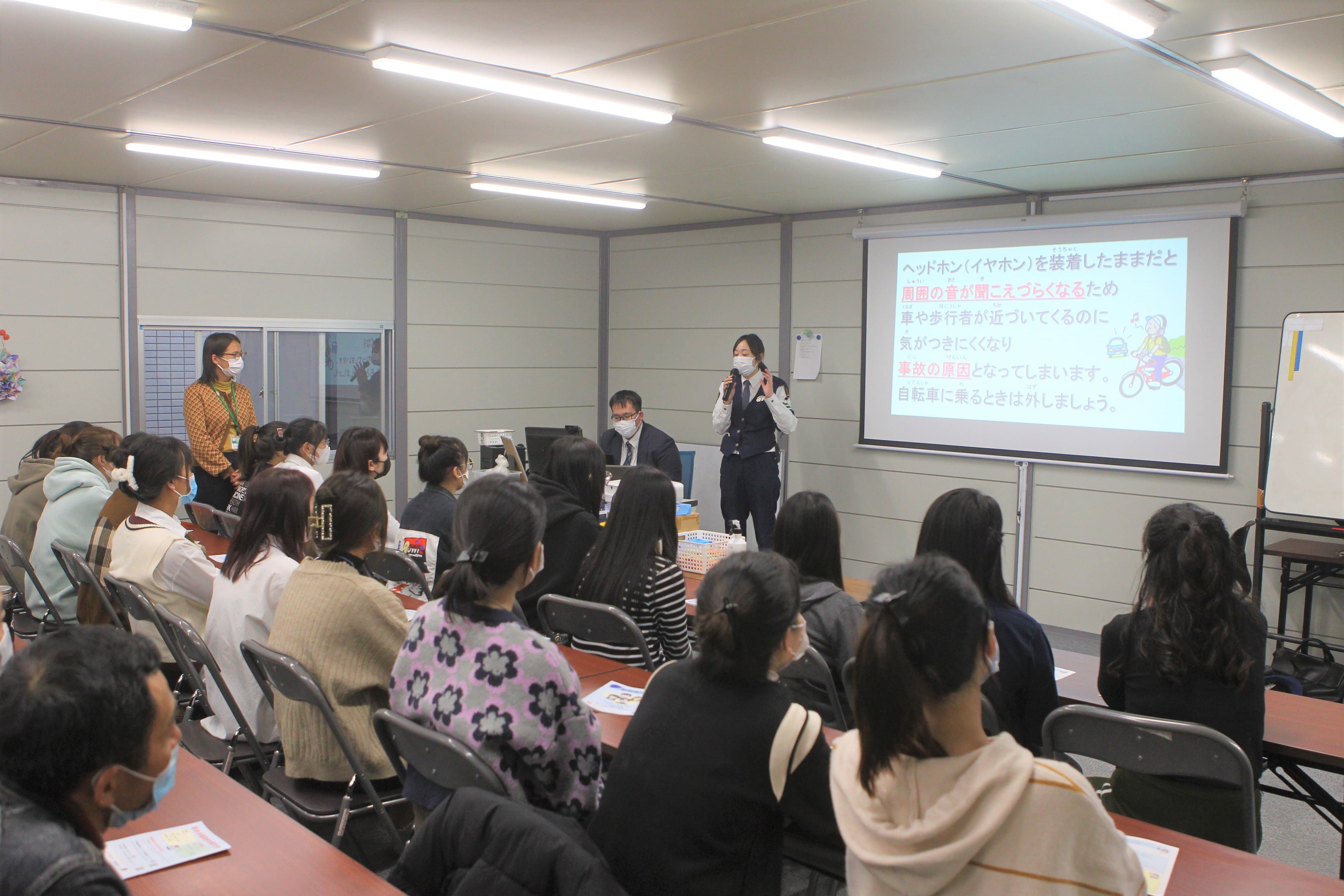 来日した実習生約60人を対象に千葉県警の協力のもと、防犯や交通ルールを指導する講話が実施されました。