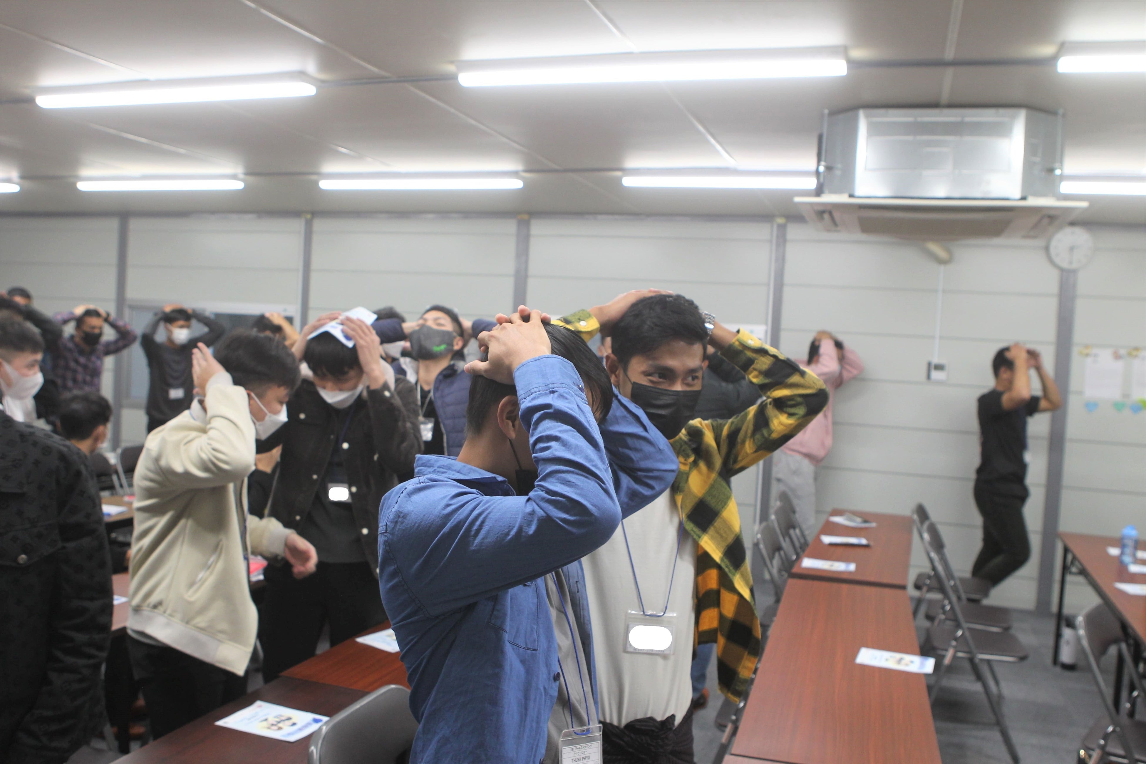日本の交通ルールや自転車の乗り方、自転車に乗るときにやってはいけないことを教わりました。地震を想定した避難訓練も実施し、緊急地震速報が出てからの対応を実践しながら机の下に身を隠してセンターの駐車場まで避難をしました。