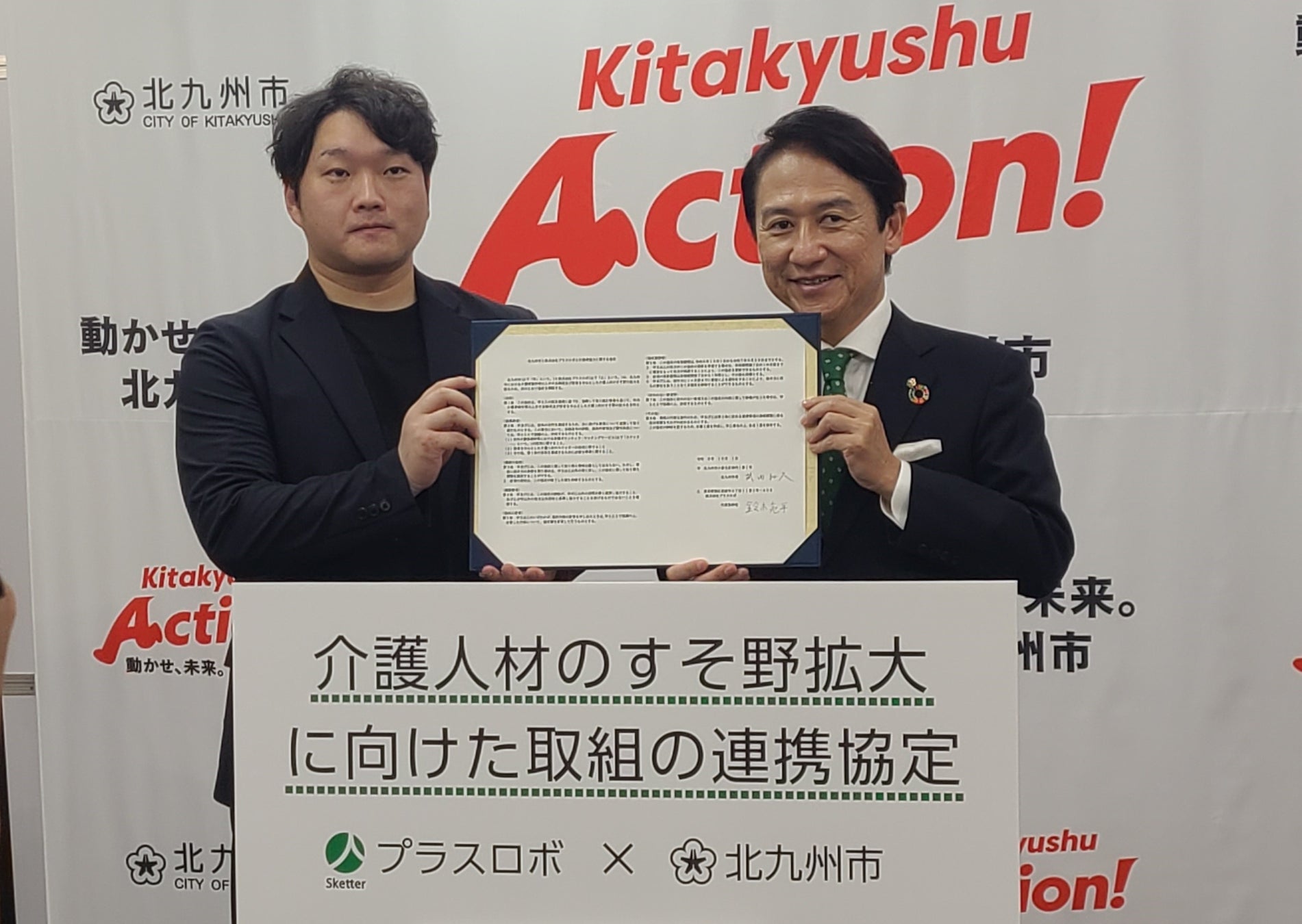 北九州市は、スケッターを提供する株式会社プラスロボ(本社:東京都、代表取締役:鈴木亮平)と介護人材確保に関する連携協定を締結しました。同社の有償ボランティアをマッチングするサービス「スケッター」を活かし、介護人材のすそ野を拡げる取組を強化します。
