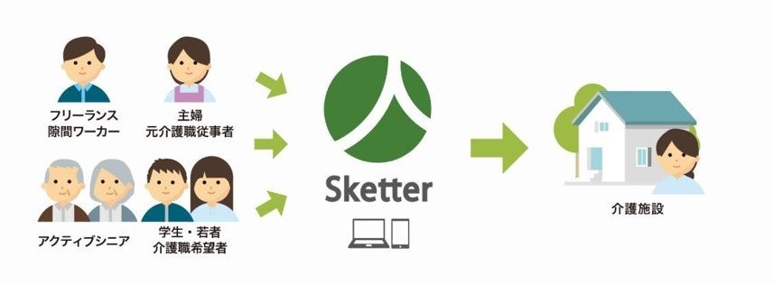 スケッターとは、レクリエーション、清掃、配膳・下膳、傾聴などのお手伝いを外注したい介護事業所等と、介護領域に関心がある市民をオンライン上でマッチングするサービスです。