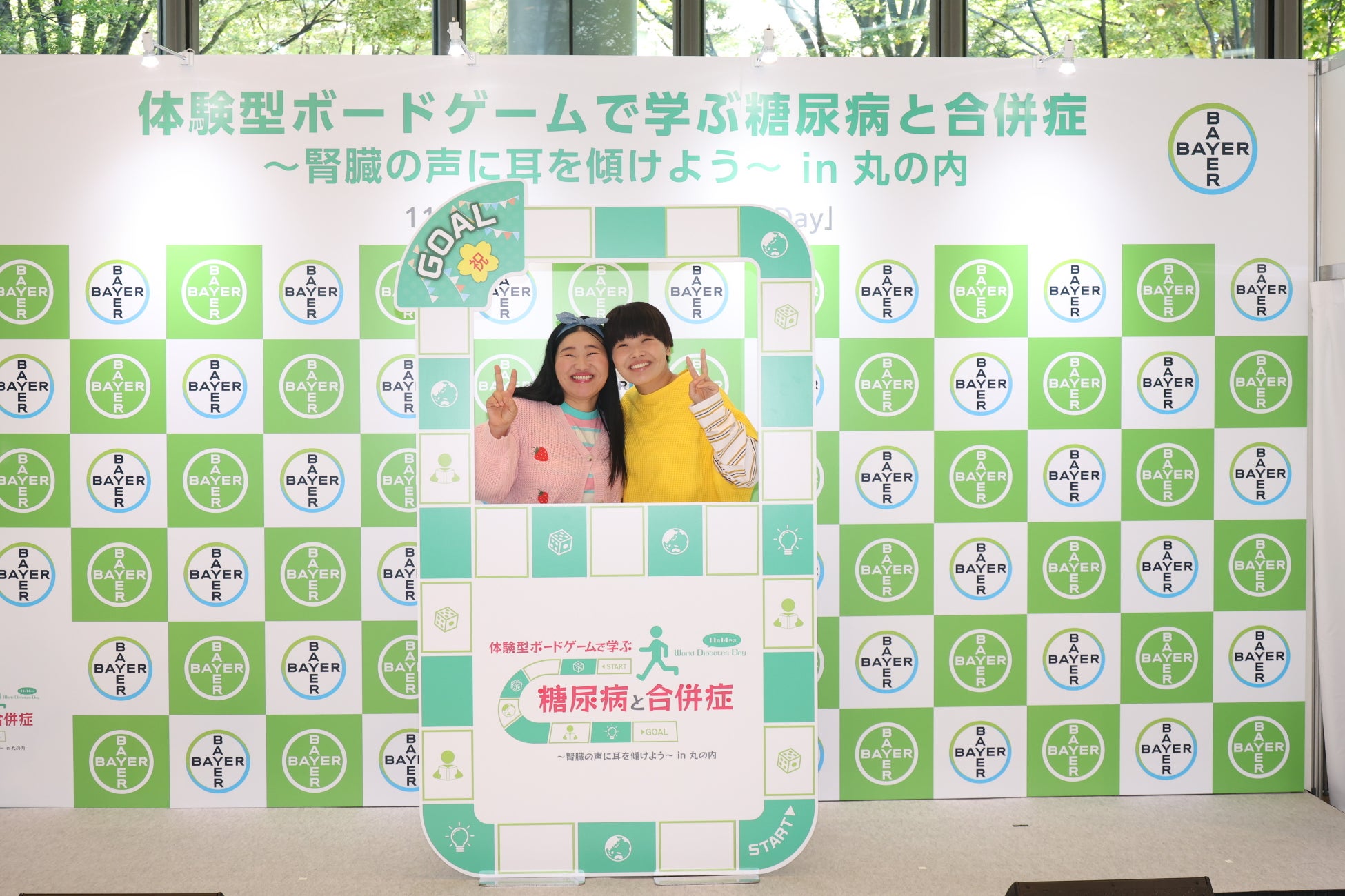 本イベントで、遠くからでも目を引いたのは、会場の床一面に広がった特大サイズのボードゲームです。参加者は、すごろくのようにサイコロを振ったりルーレットを回したりして、止まったマス目に書かれた糖尿病や合併症に関するクイズに答えながら前へ進み、ゴールを目指しました。ボードゲームにチャレンジしたガンバレルーヤのお二人も、その大きさに興奮。坊内先生とのトークセッションで話題になった糖尿病性腎症について、クイズ「透析患者のうち糖尿病性腎症の割合は?」に挑戦したまひるさんは、「約4割」と即答して見事クイズに正解。「すごい、まーちゃん覚えてる!」とよしこさんにほめられ喜んでいました。ゴールした後、仲良くフォトフレームに収まったお二人は、ボードゲームの感想について「すごく楽しかった!ルーレットを回したら『10回ジャンプ』の表示が出て、また息切れしちゃったけど」(よしこさん)、「楽しみながら学べるのがよいですね」(まひるさん)と話しました。