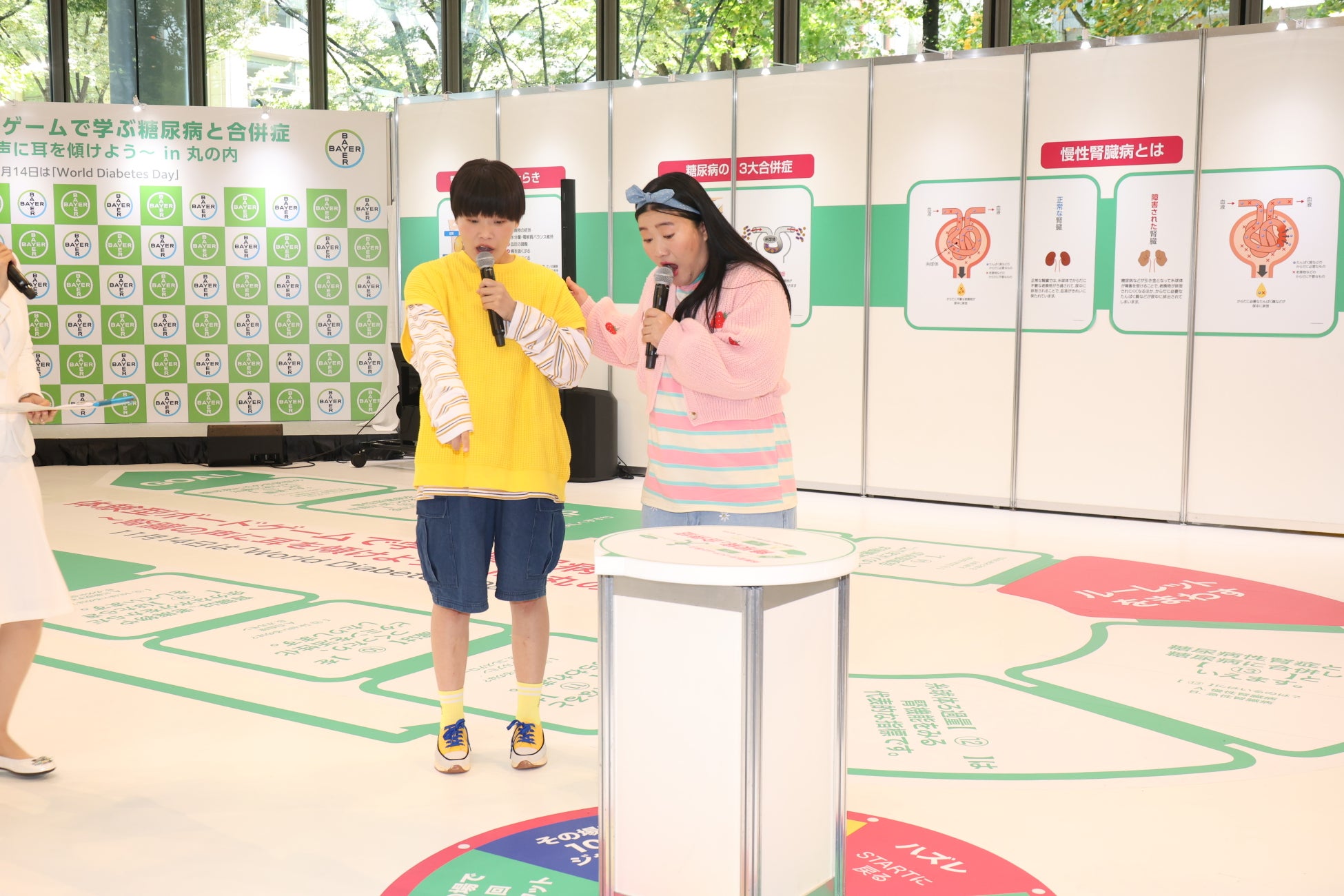 坊内先生は糖尿病の三大合併症として、網膜症、腎症、神経障害を挙げた上で、糖尿病性腎症はかなり進行するまで自覚症状に乏しいことに言及。「定期的な検査、特に尿検査を行い、このイベントのタイトルにもなっている『腎臓の声』にしっかり耳を傾けよう」と呼び掛けました。ガンバレルーヤのお二人は腎臓が悪くなったときの症状が紹介されると、よしこさんは「少し動いただけで息切れするんです。家族みんな、揚げ物も大好きですし」と話す一方、気になる項目がいくつもあったまひるさんは「自覚症状が出にくいからきちんと病院に行って定期的に検査を受けることが大事なんですね」と早期発見の大切さを納得していました。