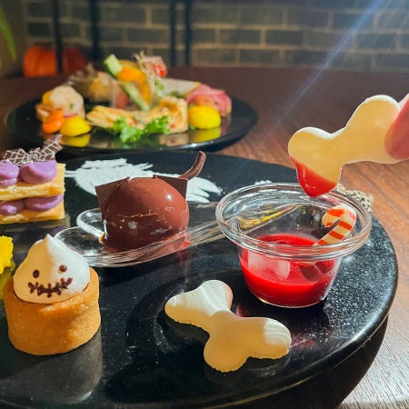 かわいらしいフォルムの★黒猫ムースや★ミニゴースト。★ホネホネマカロンはフランボワーズソースをつけていただきます。他にもかぼちゃや紫イモなどハロウィンテイスト満載のスイーツプレート。さらに、5種のライトミールプレート、ホテルパティシエが焼き上げる自家製スコーン3種の食べ放題(90分)、フリードリンク(90分)、乾杯ノンアルコールスパークリングワインがセットの盛りだくさんのアフタヌーンティーです。