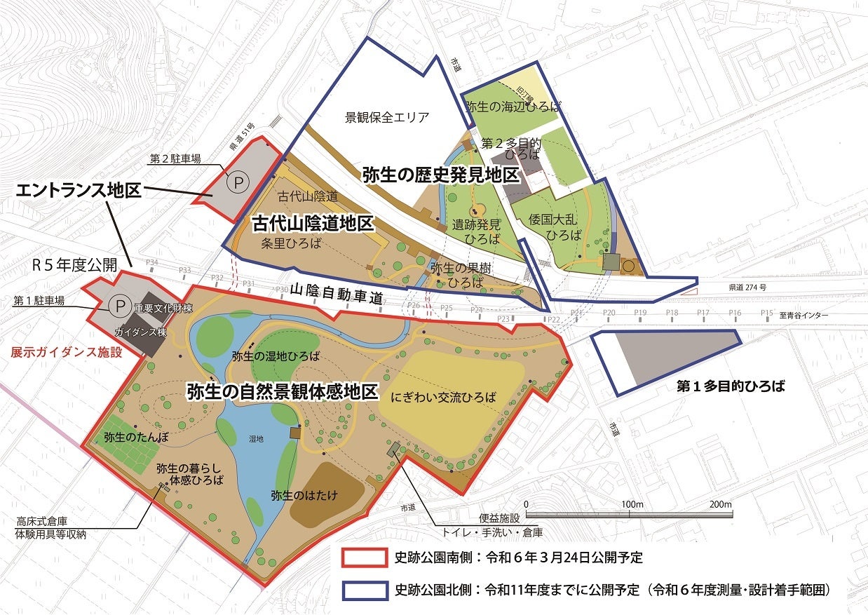 3月24日に開園する「青谷かみじち史跡公園」で公開がはじまるのは、史跡の南側と展示ガイダンス施設です。公園として整備した範囲は約7ヘクタール。