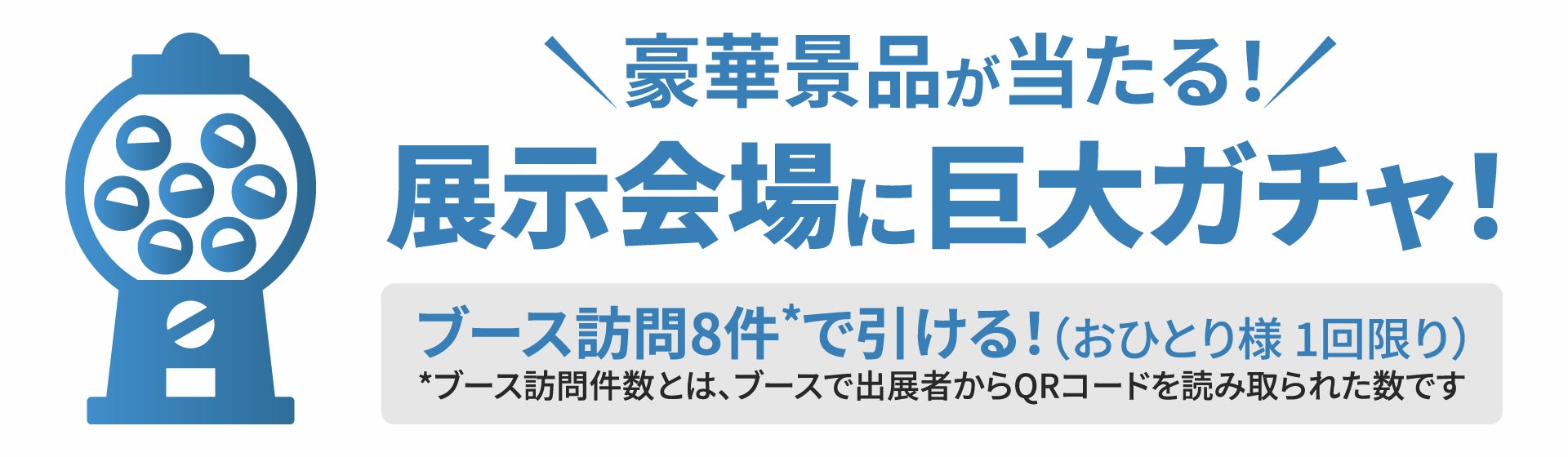 展示会開催中には、出展社ブースを8件訪問していただくと回せるガチャを実施しています!豪華景品をご用意していますので、奮ってご参加ください。