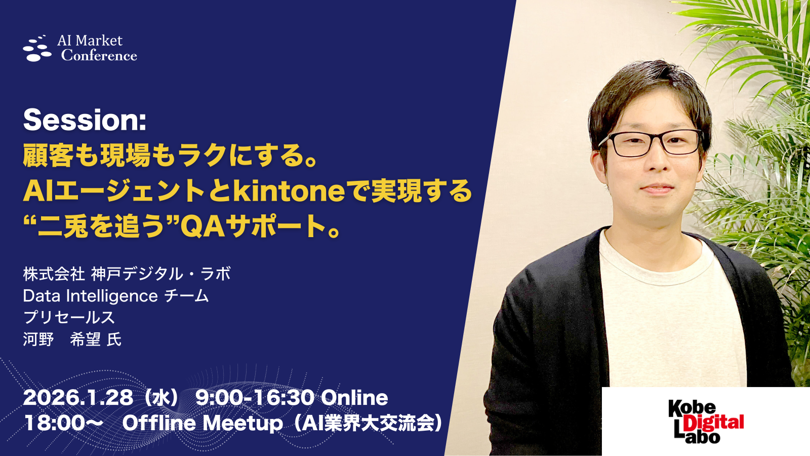【登壇情報】神戸デジタル・ラボ社による「顧客も現場もラクにする。AIエージェントとkintoneで実現する“二兎を追う”QAサポート。」|1.28|AI Market Conference 2026