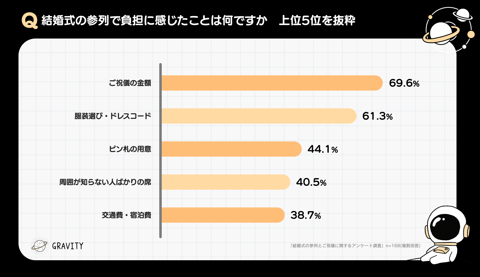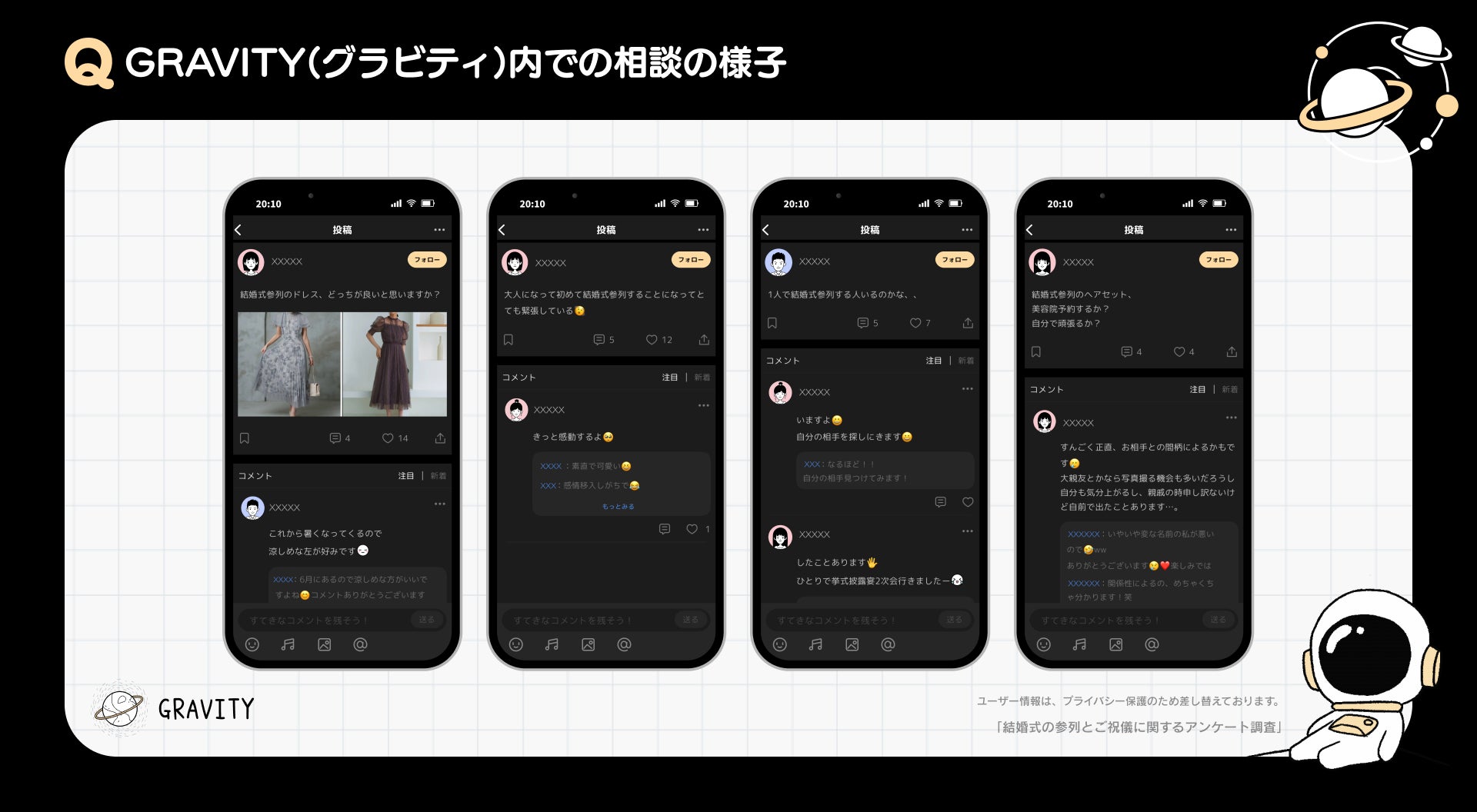 当社が運営する『GRAVITY(グラビティ)』では、誰かに個人を特定される心配がなく気楽に投稿できる安心な環境なため、周囲に相談しづらい結婚式の参列・ご祝儀についても相談やアドバイスが行われています。