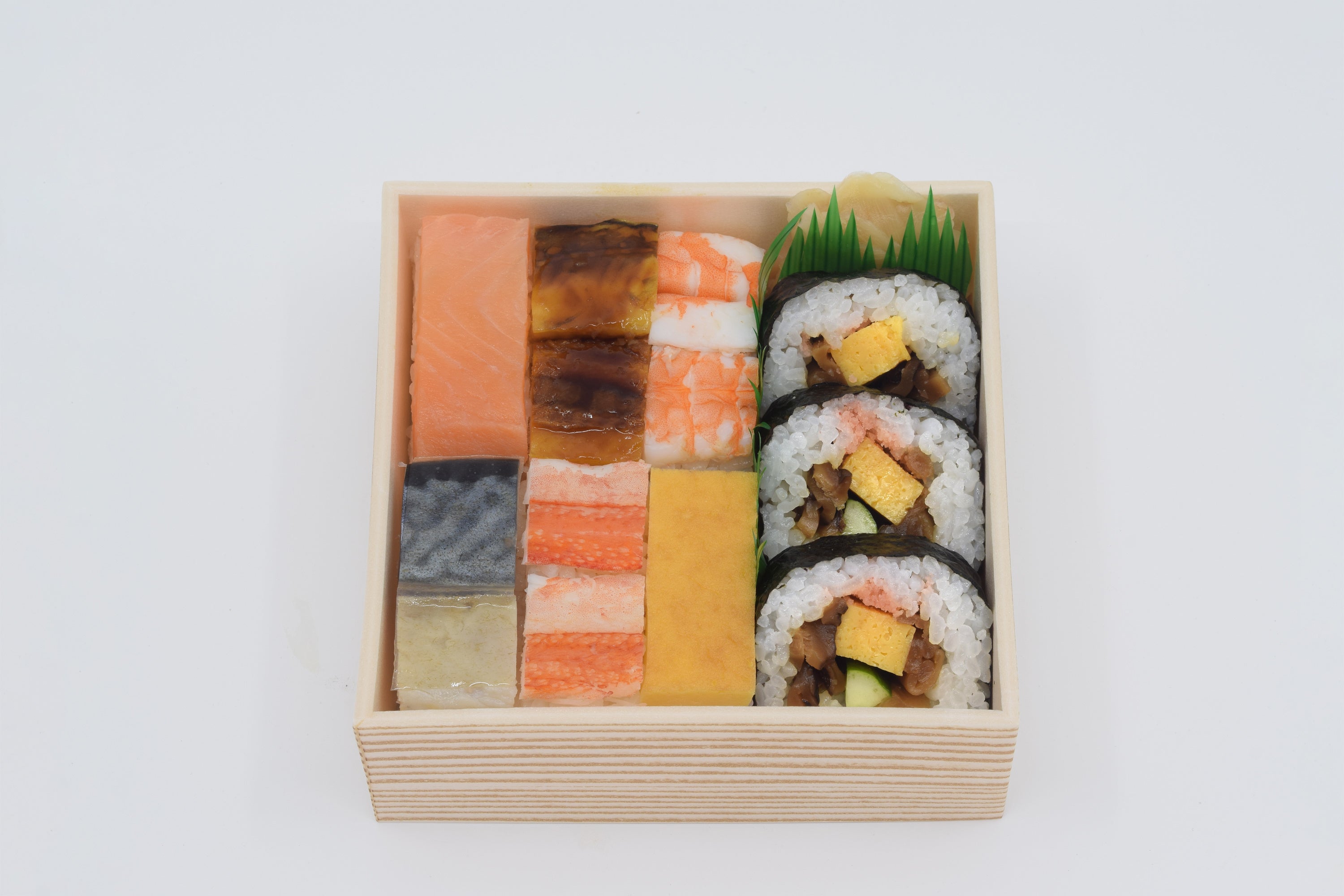 ◯具材内容:押寿司(サーモン、穴子、海老、バッテラ、ズワイガニ、玉子焼)・太巻