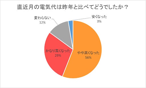 「直近月の電気代は昨年と比べてどうでしたか?」という質問では、「やや高くなった」が168票(56%)、「かなり高くなった」が87票(29%)を集め、結果として「高くなった」との回答が計85%を占めました。