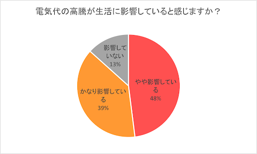 「電気代の高騰が生活に影響していると感じますか?」という質問では、「やや影響している」が144票(48%)、「かなり影響している」が116票(39%)を集め、「影響していない」が40票(13%)でした。