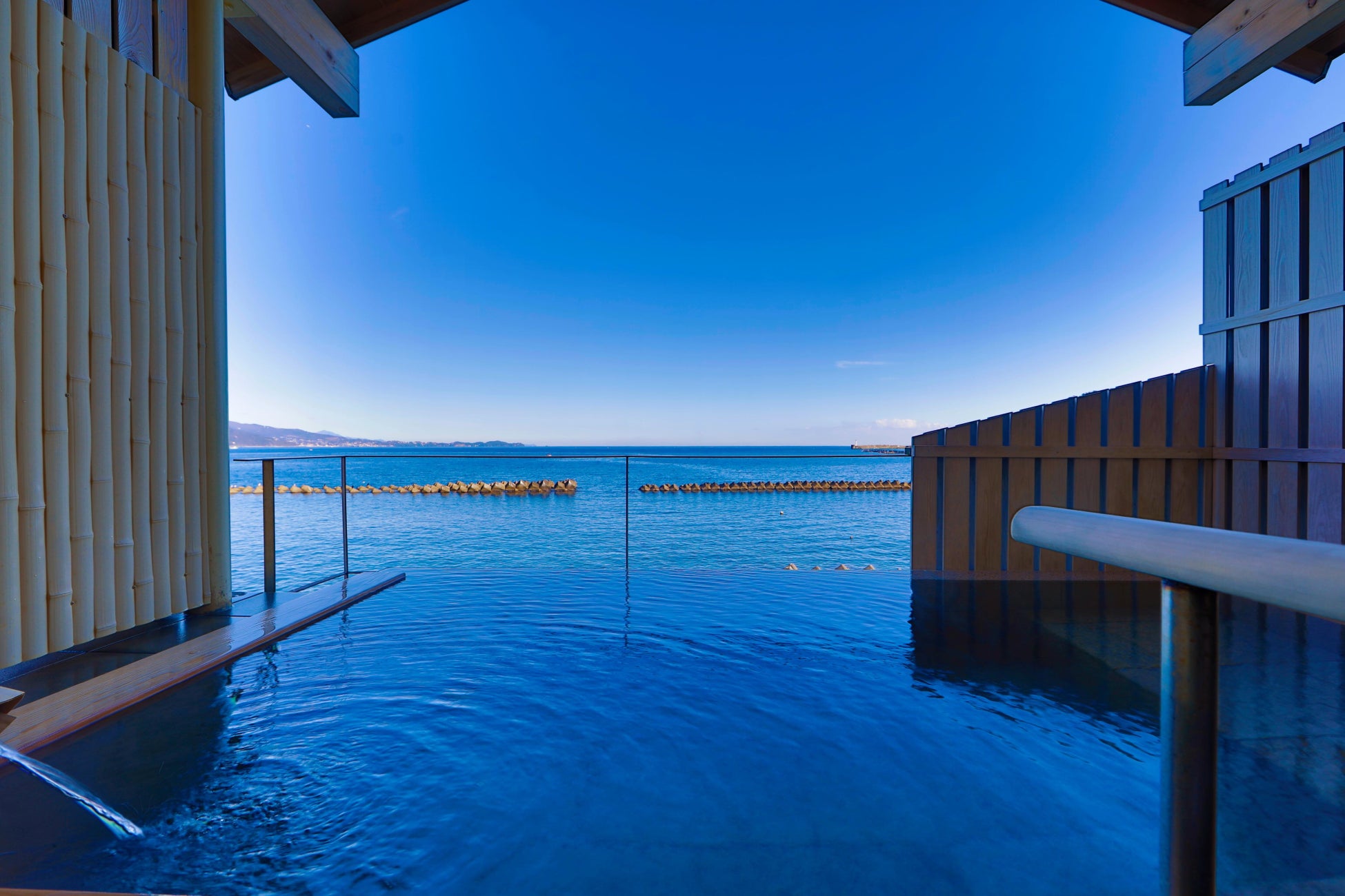 熱海では非常に珍しい、国道より海側に建っている最高のロケーションなので、伊豆半島随一のインフィニティ風呂です。当館を象徴する貸切露天風呂で、多くの利用者がインスタで絶景を共有して頂いています。湯舟のすぐ下に海があるため、熱海の景色と湯船が織り成すコントラストをお楽しみ下さい。