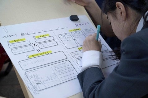 最終時間では、発表に向けてアイデアを「つたえるシート」にまとめ、具体的なフロー設計とビジュアル化に取り組みました。生徒たちはチームごとに、「誰の困りごとを」「どんなステップで」「どう解決するのか」を整理し、絵や図を交えて表現。実際の利用シーンや関わる人々の動きを想定しながら、発想を“形”にする作業を進めました。