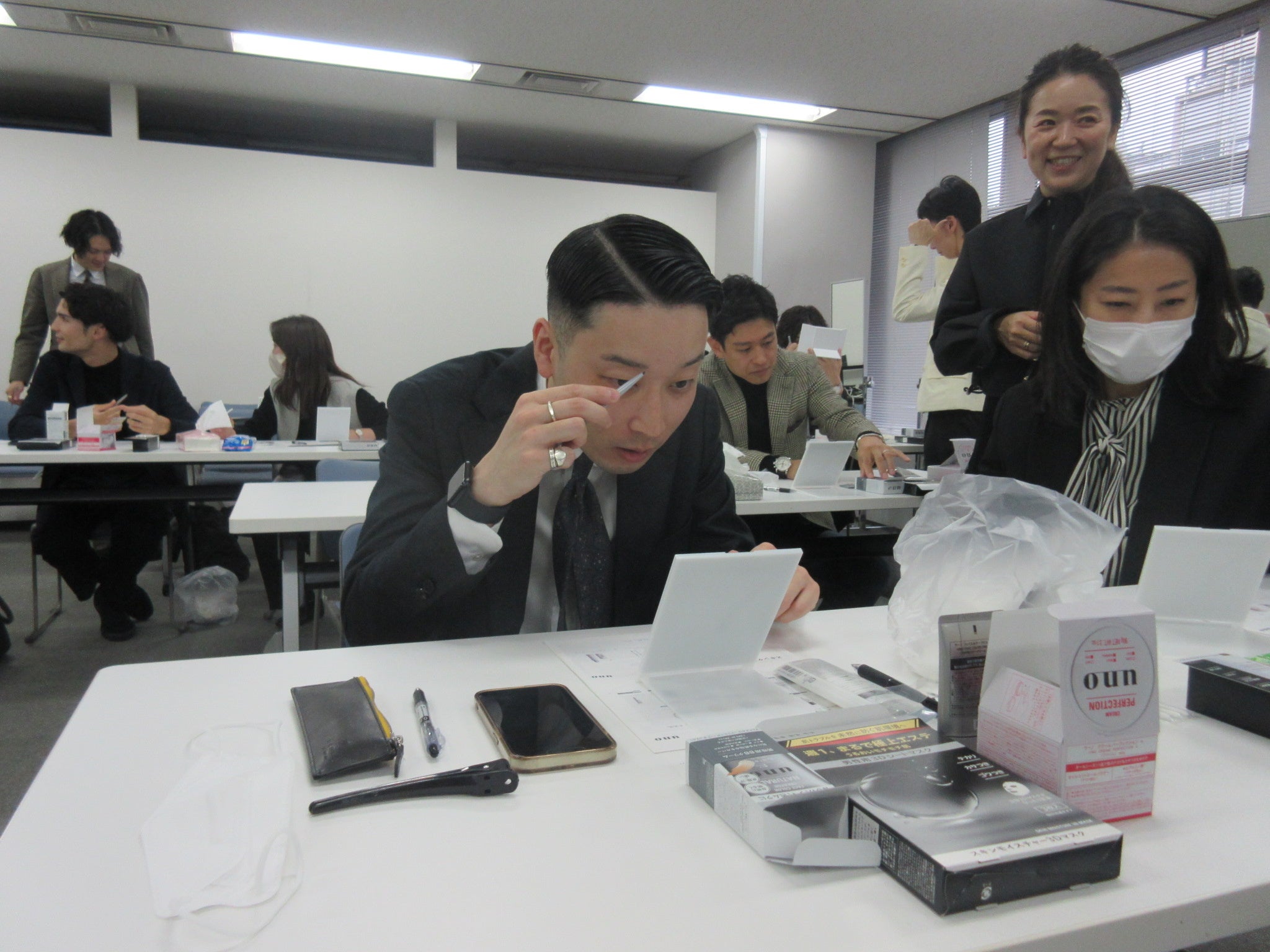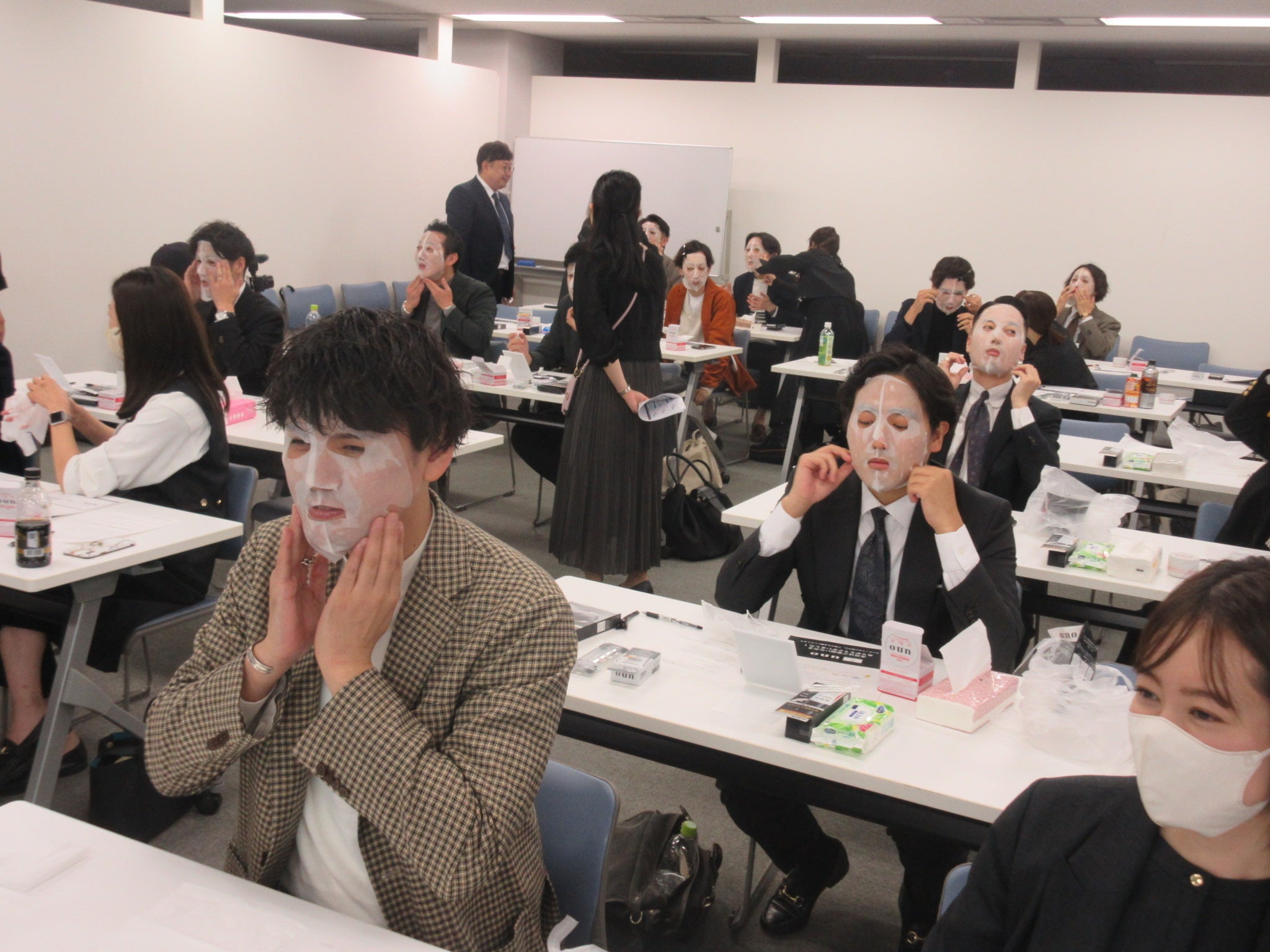 セミナーでは、市場トレンドや男性肌の特徴などの知識を得た上で、ヘアメイクアップアーティスト 中村潤氏によるスキンケアやメイクのレクチャー・実践、その後、お客さまにどのようにして「トータルコーディネート提案」を行うのかをグループでディスカッションを行いました。セミナーでの学びをさらに現場でも活かすべく、座学だけでなく自らの手で体験し、互いの考えを共有しあうことで自分ごと化をより深めることができ、トータルコーディネート提案の答えを探す機会となりました。