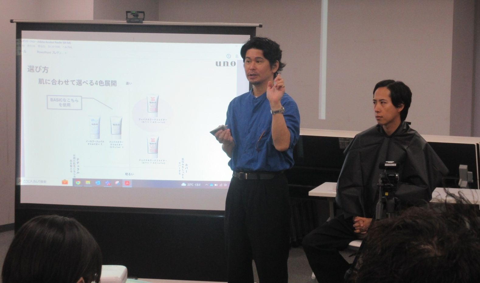 2社の協業の一歩として、まずはスーツ選びに迷うお客さまを店舗でサポートする店舗従業員24名へのレクチャーや実践を行う「uno流!特別メンズスキンケア・メイクセミナー」を、店頭販売に先駆けて10月4日(水)に開催しました。