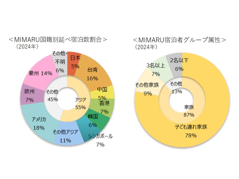 アパートメントホテル「MIMARU」は、キッチン、リビング・ダイニングスペース付きの約40㎡からの広い客室を備え、“みんなで泊まる”を楽しむアパートメントホテルです。 年間40万人を超える宿泊者の約9割が海外ゲスト・ご家族での利用で、子ども連れ家族が多く利用されています。37の国と地域から集まった文化や経験の異なるスタッフがゲストをお迎えし、世界中から訪れる訪日旅行者に、日本での最高の体験をお届けしています。※2024年実績