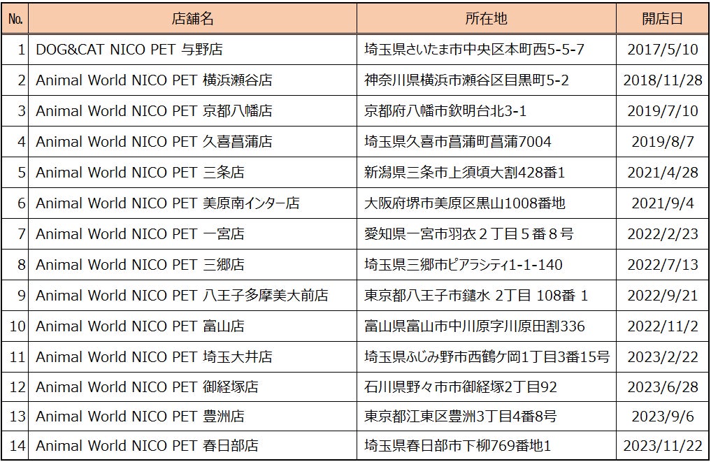 NICO PET春日部店の出店により、全国のNICO PETは14店舗になりました。