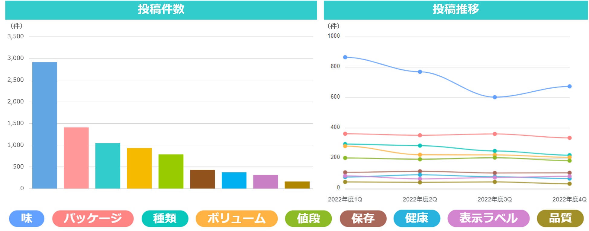 お惣菜の不満項目毎に見た不満投稿数は、1位 味、2位 パッケージ、3位 種類 と続いた。