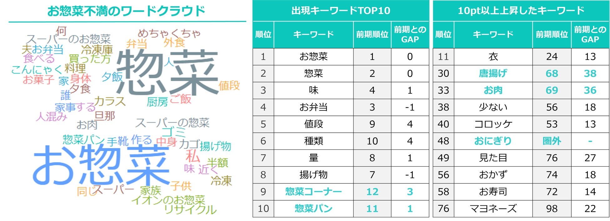 出現ワードランキングで新たにTop10入りしたものは「惣菜コーナー」「惣菜パン」。 l10pt以上順位を上げたキーワードの中でも特に顕著なものは、「唐揚げ」「お肉」「おにぎり」となった。