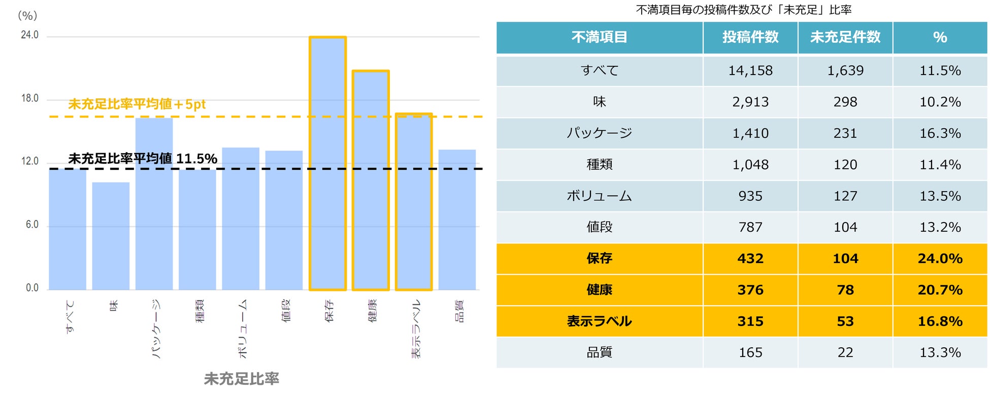お惣菜の不満項目毎の「未充足」の投稿件数と比率を比較した。 l未充足不満の投稿件数は「味」「パッケージ」「ボリューム」が上位となった。 l未充足不満の比率は「保存」「健康」「表示ラベル」が全体平均の11.5%を5pt以上上回った。