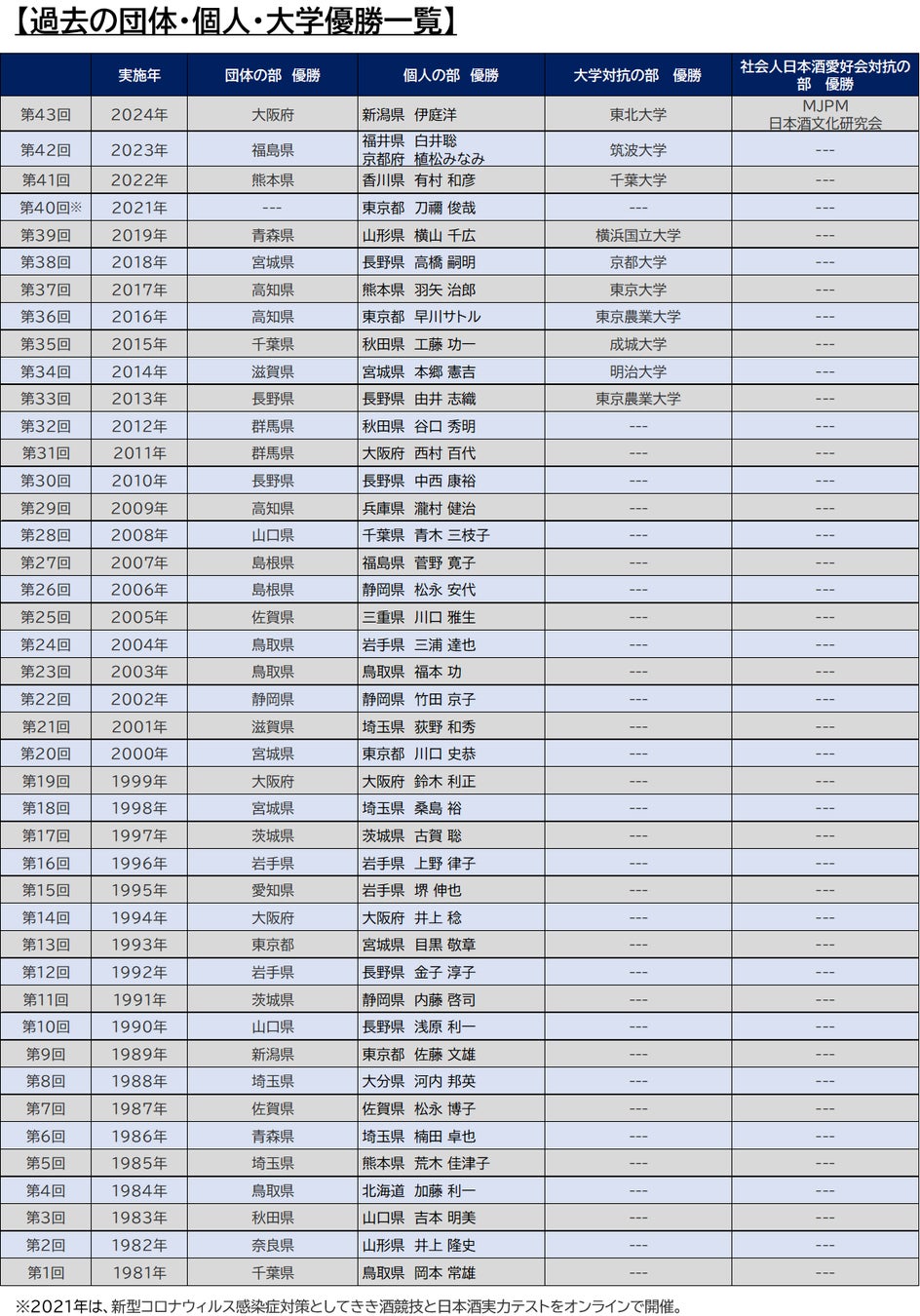なお、全国大会の出場選手数は計73名(予定)となり「一般の部」の代表選手は「個人戦」と、2名の合計点で競い合う「団体戦」の2カテゴリーで”きき酒日本一”の座をかけます。