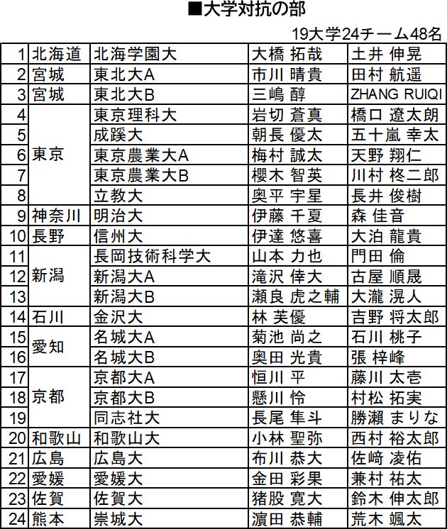 ①各都道府県(個人戦/団体戦)2名1チーム ②大学対抗の部:2名1チーム ③社会人日本酒愛好会対抗の部:2名1チーム |