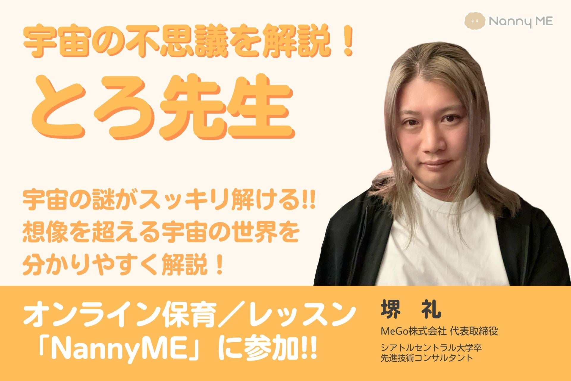 堺氏は景観改善プラットフォーム「MeGo」の代表取締役社長として知られていますが、NannyMEでは「とろ先生」として子どもたちに宇宙の不思議を教える新しい役割を担います。