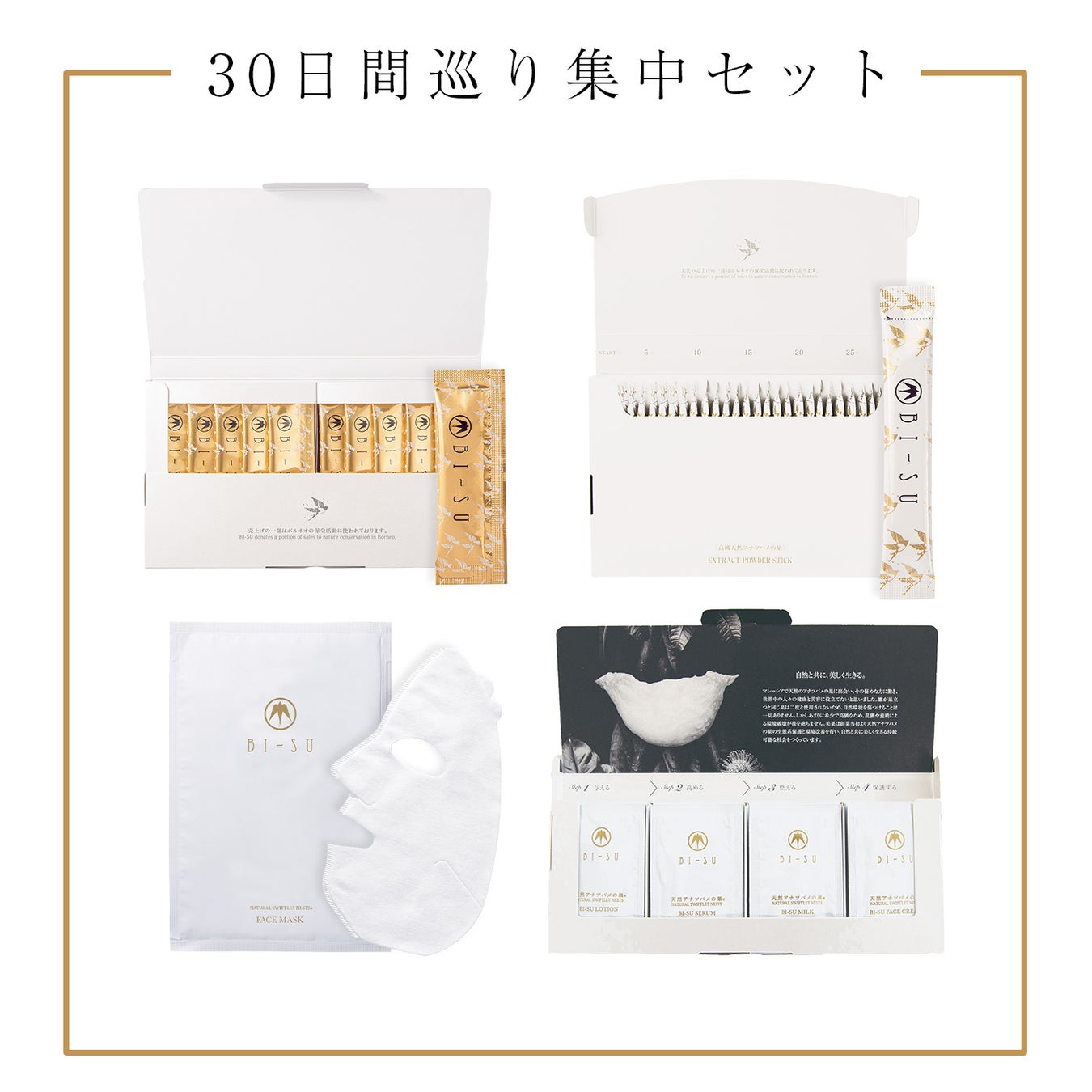 「30日間巡り集中セット」は、体内環境の調和が美しい肌を育むというBI-SUの理念を体現したトータルケアセットです。天然のアナツバメの巣を使用した独自技術でその力を最大限に引き出しました。