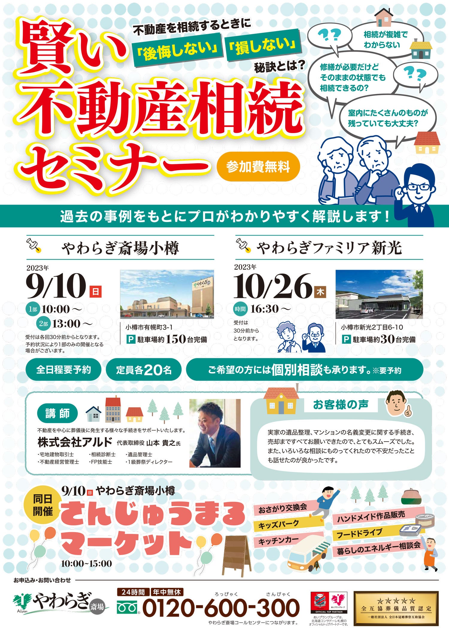 9/10やわらぎ斎場小樽、10/26 やわらぎファミリア新光にて、『賢い不動産相続セミナー』を開催。不動産相続について学べるほか、ご希望の方にはお悩みについてご相談いただける個別相談会も開催します