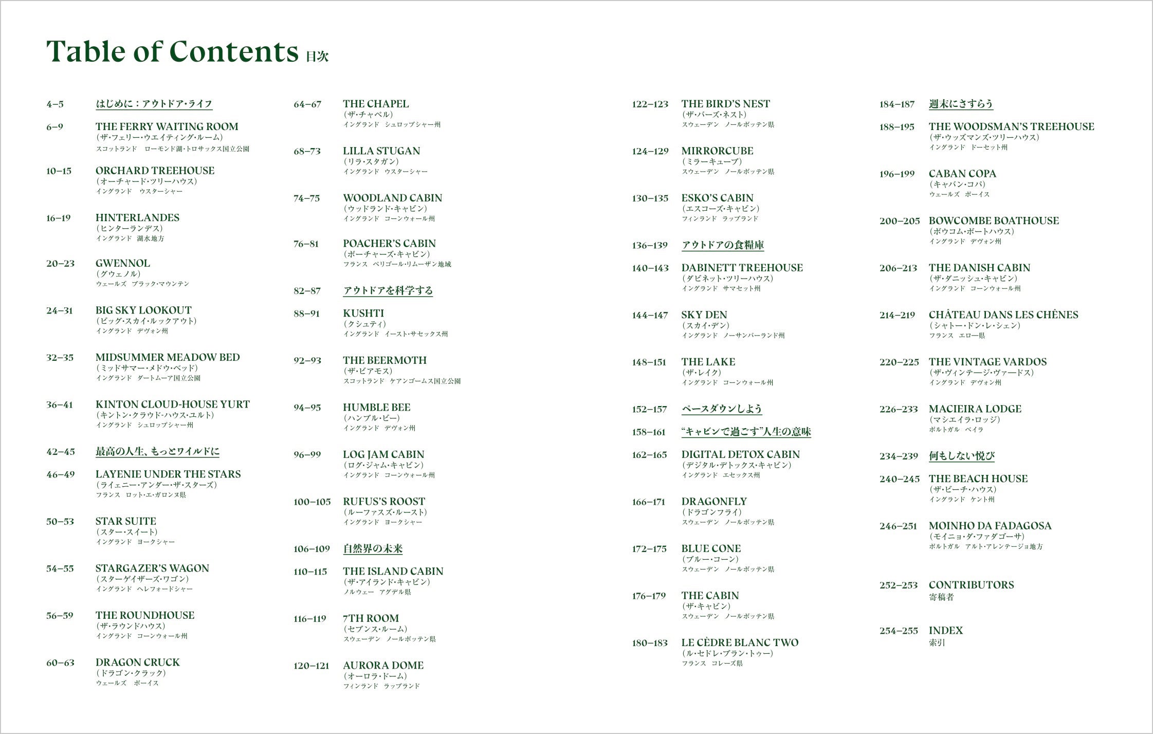 【本文】THE FERRY WAITING ROOM(スコットランド ローモンド湖・トロサックス国立公園)の他、計44のキャビン、8つのコラム(各4~6ページ)を掲載