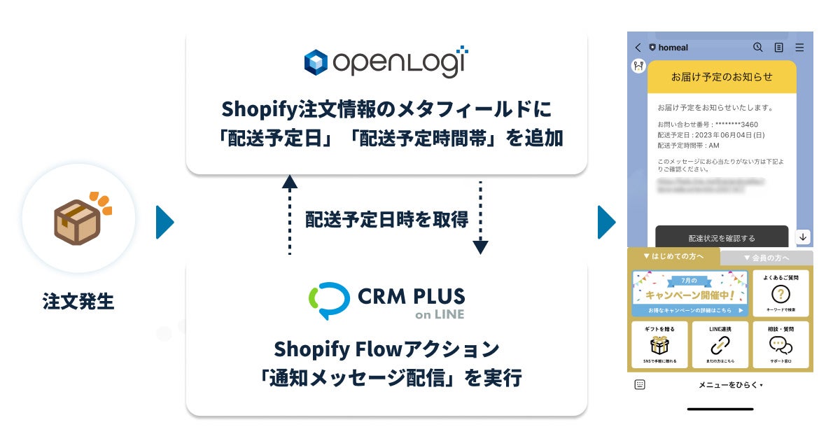 ▲「オープンロジ」と「CRM PLUS on LINE」の共通ユーザーである「homeal( https://homeal.co.jp/ )」様での活用事例:発送通知をLINE通知メッセージで配信