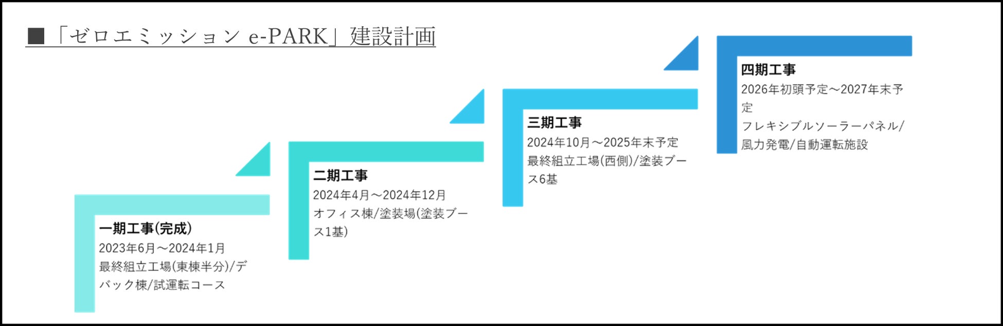・式典プログラム:e-PARK概要説明、新車種概要説明、AGVを使用した組立工場デモンストレーション、オフィス棟お披露目、デバッグ棟お披露目、試運転コースでのEV試乗・車両パレード