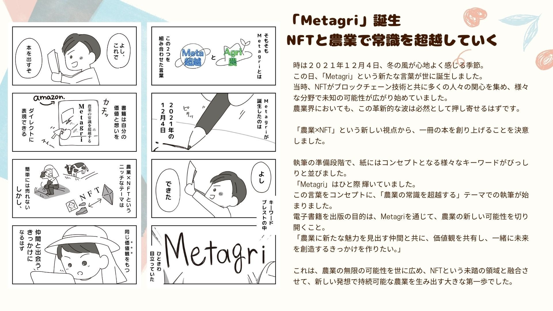 「Metagri物語」は、農業とweb3(NFT、DAO、DeFiなどのブロックチェーン技術)を掛け合わせたMetagri研究所の2年にわたる取り組みを4コマ漫画で紹介した電子書籍です。