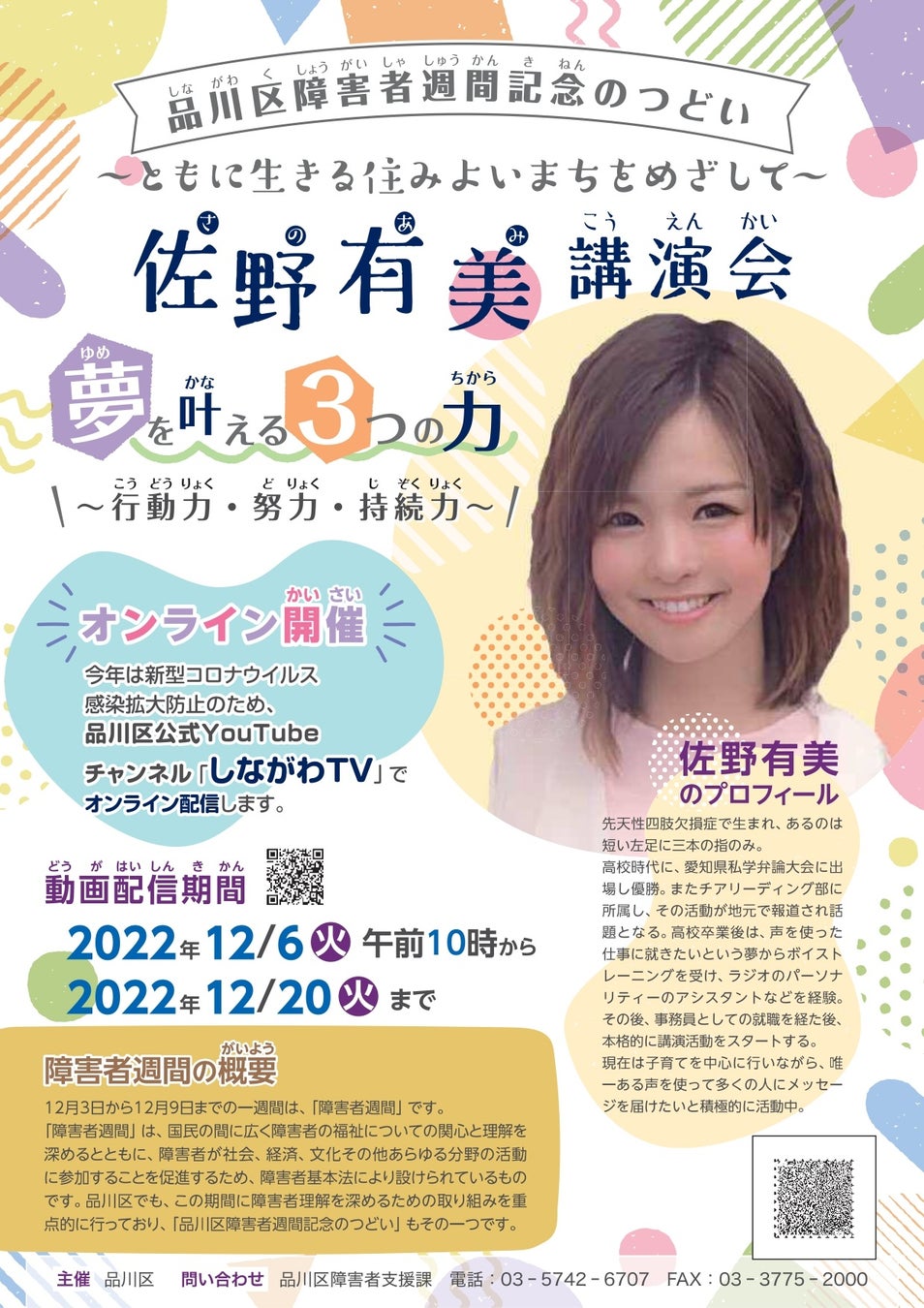 品川区は12月6日~12月20日、「令和4年度品川区障害者週間記念のつどい」をオンラインで開催します。期間中、品川区公式YouTubeチャンネル「しながわネットTV」で佐野有美(さのあみ)さんの講演会を配信します。