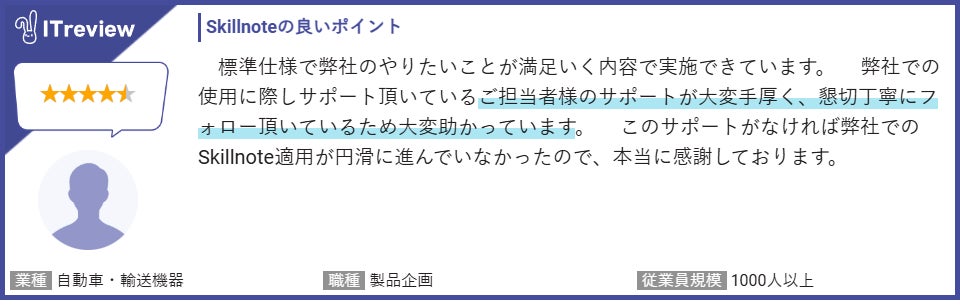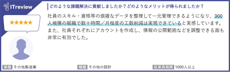 製造業のスキルマネジメントやスキルベース組織に関するユーザーレビューで高評価を獲得