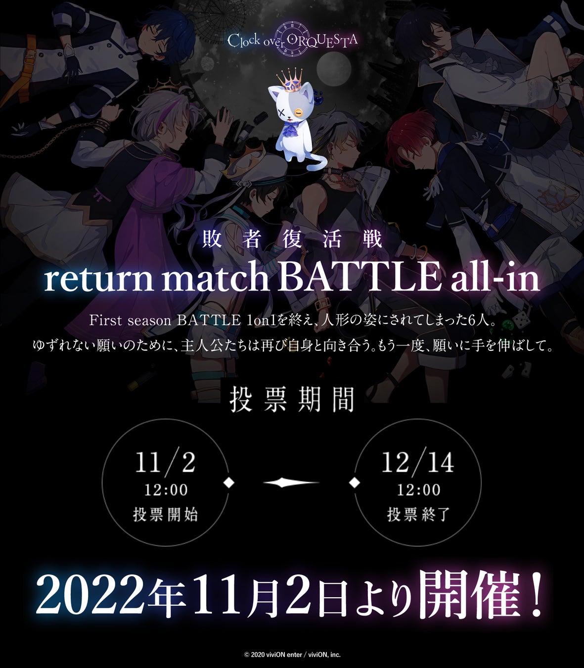 First season BATTLEで敗れた6名による敗者復活戦「return match BATTLE all-in」を2022年11月2日12時〜12月14日12時の期間に開催します。