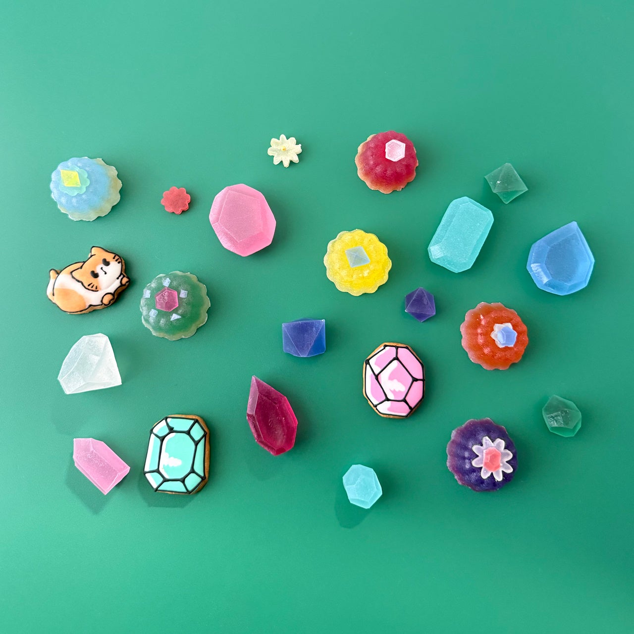 「わさびの食べる音」は、カラフルで美味しそうなスイーツを、素敵な音と映像で届けてくれるSNS総フォロワー数80万人を超える大人気ASMR YouTuber。これまでにもハラペコラボのスイーツを数多くご紹介いただいており、見ているだけで心がときめく映像がいっぱい!2024年8月に期間限定でリリースしたコラボ企画では、予想を超えた大反響を博しました。今回待望の2025年バージョンのコラボ企画が実現。わさびさんのアイデアから生まれたテーマは「レトロ喫茶」。レトロ喫茶のカラフルなゼリーを琥珀糖で再現し、そこに小さな宝石や鉱物の輝きを加えた“宝石ゼリー”や、宝石をモチーフにしたアイシングクッキーをご用意しました。まるで不思議な喫茶店に迷い込んだような懐かしさとときめきを感じるスイーツをお楽しみいただけます。